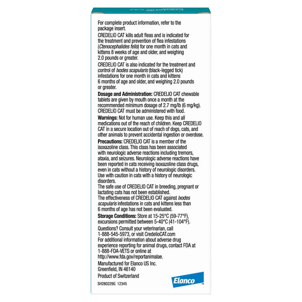 Active ingredient lotilaner is a member of the isoxazoline class of drugs. This class has been associated with neurologic adverse reactions including tremors, incoordination, and seizures. Neurologic adverse reactions have been reported in cats receiving isoxazoline class drugs, even in cats without a history of neurologic disorders. Use with caution in cats with a history of neurologic disorders. The safety of Credelio CAT has not been established in breeding, pregnant and lactating cats. The effectiveness of Credelio CAT against black-legged ticks in kittens less than 6 months of age has not been evaluated. The most frequently reported adverse reactions are weight loss, rapid breathing and vomiting. For complete safety information, please see Credelio CAT product label or ask your veterinarian. Credelio requires a prescription from your veterinarian.