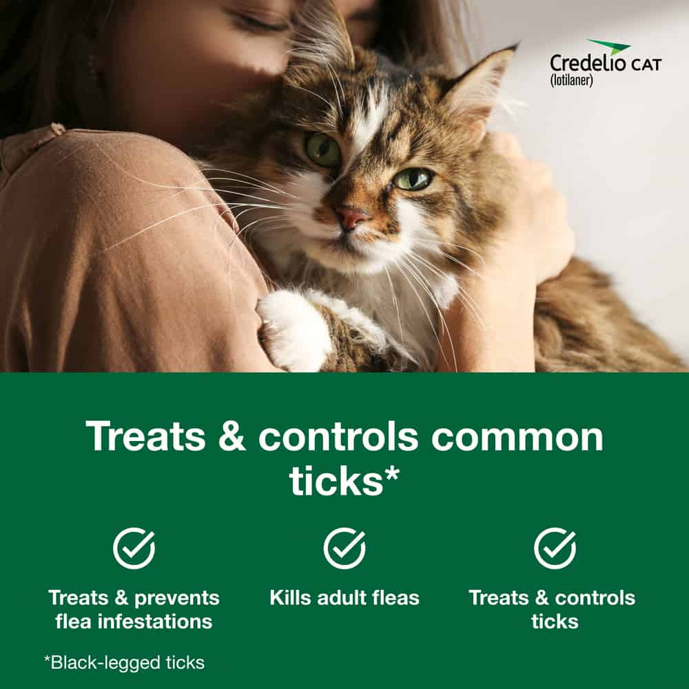 Credelio treats and prevents flea infestations in cats and kittens 8 weeks of age and older. It also treats and controls Ixodes scapularis tick infestations in cats and kittens 6 months of age and older.