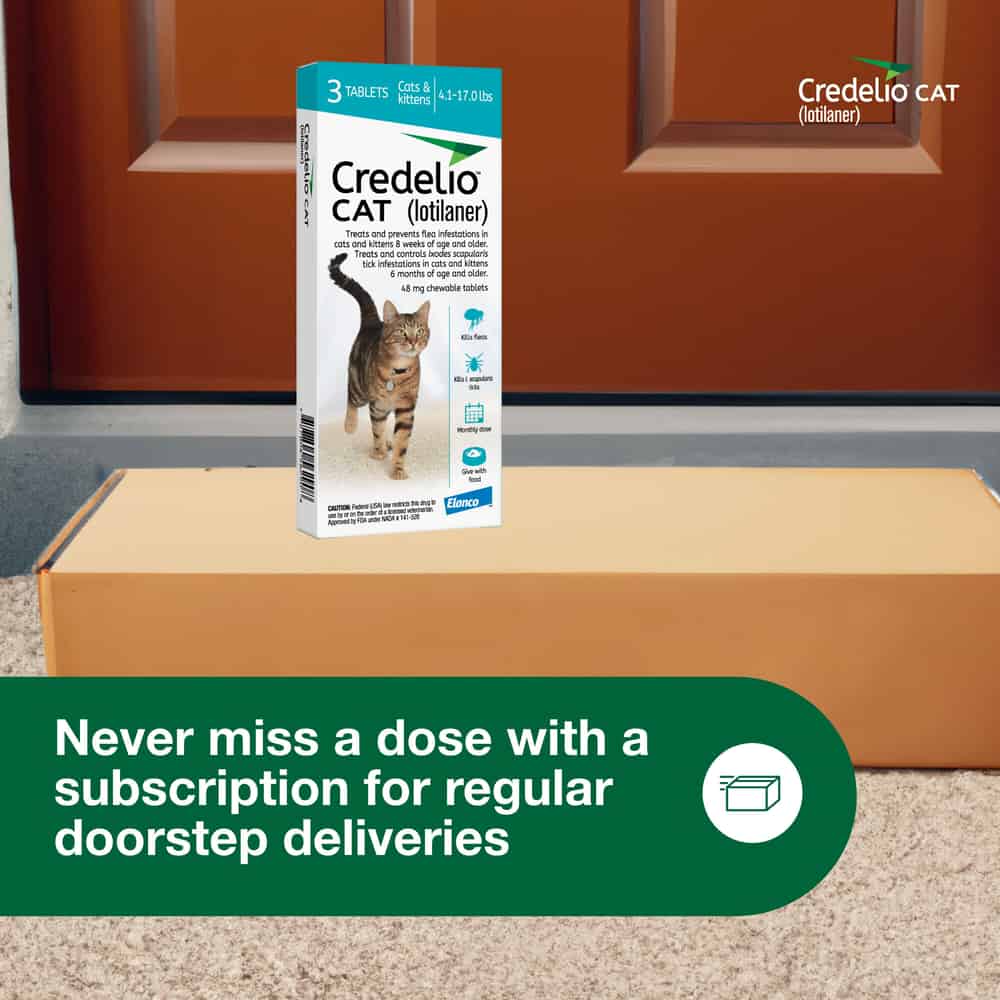 Never miss a month of treatment when you subscribe to regular deliveries of Credelio CAT chewable tablets available in packages of either 1-dose, 3-dose or 6-dose protection.