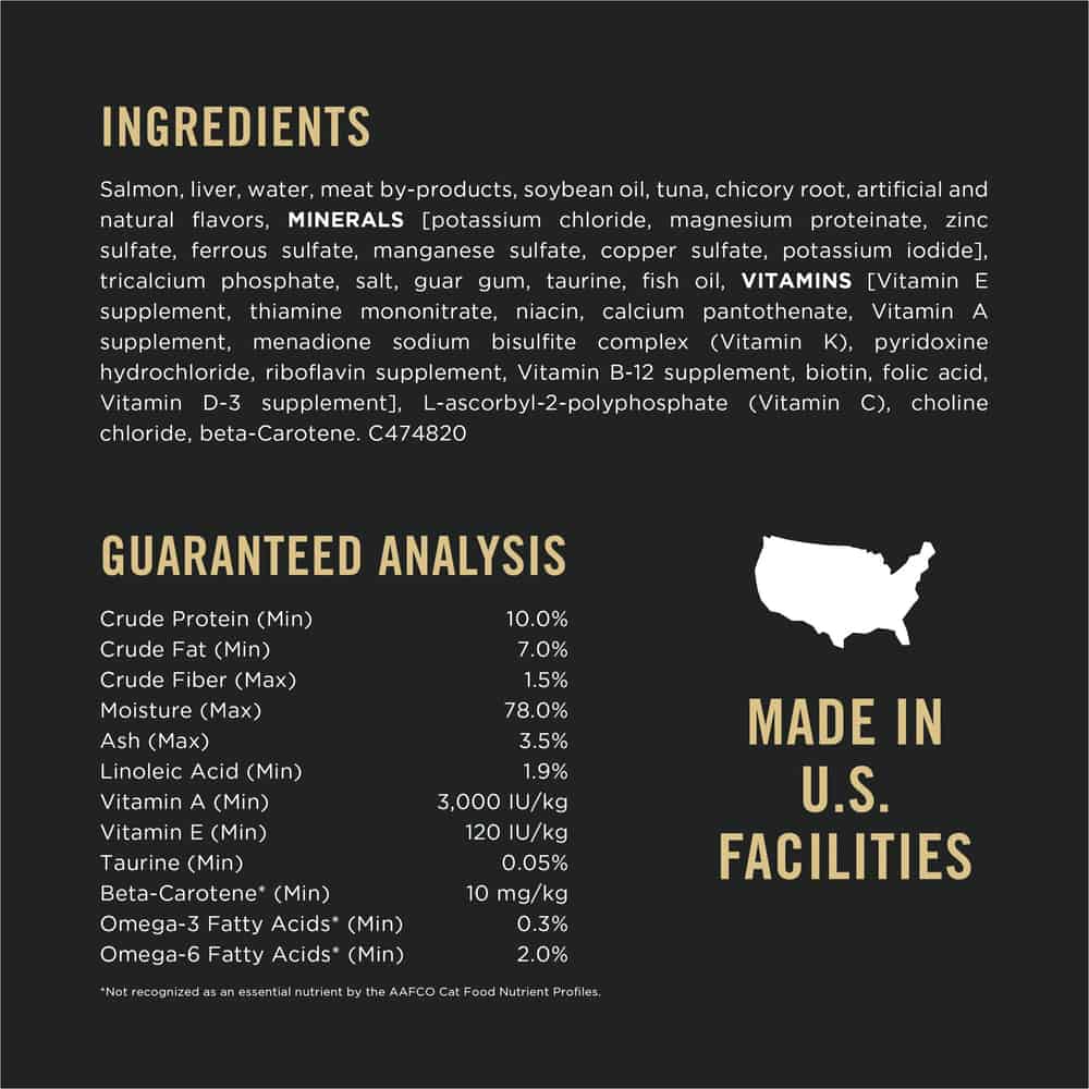 | Salmon, Liver, Water, Meat By-Products, Soybean Oil, Tuna, Chicory Root, Artificial And Natural Flavors, MINERALS [Potassium Chloride, Magnesium Proteinate, Zinc Sulfate, Ferrous Sulfate, Manganese Sulfate, Copper Sulfate, Potassium Iodide], Tricalcium Phosphate, Salt, Guar Gum, Taurine, Fish Oil, VITAMINS [Vitamin E Supplement, Thiamine Mononitrate, Niacin, Calcium Pantothenate, Vitamin A Supplement, Menadione Sodium Bisulfite Complex (Vitamin K), Pyridoxine Hydrochloride, Riboflavin Supplement, Vitamin B-12 Supplement, Biotin, Folic Acid, Vitamin D-3 Supplement], L-Ascorbyl-2-Polyphosphate (Vitamin C), Choline Chloride, Beta-Carotene. C474820 |