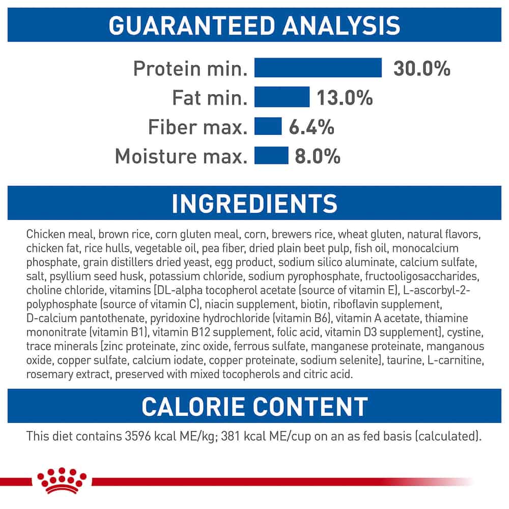| Chicken meal, brown rice, corn gluten meal, corn, brewers rice, wheat gluten, natural flavors, chicken fat, rice hulls, vegetable oil, pea fiber, dried plain beet pulp, fish oil, monocalcium phosphate, grain distillers dried yeast, egg product, sodium silico aluminate, calcium sulfate, salt, psyllium seed husk, potassium chloride, sodium pyrophosphate, fructooligosaccharides, choline chloride, vitamins [DL-alpha tocopherol acetate (source of vitamin E), L-ascorbyl-2-polyphosphate (source of vitamin C), niacin supplement, biotin, riboflavin supplement, D-calcium pantothenate, pyridoxine hydrochloride (vitamin B6), vitamin A acetate, thiamine mononitrate (vitamin B1), vitamin B12 supplement, folic acid, vitamin D3 supplement], cystine, trace minerals [zinc proteinate, zinc oxide, ferrous sulfate, manganese proteinate, manganous oxide, copper sulfate, calcium iodate, copper proteinate, sodium selenite], taurine, L-carnitine, rosemary extract, preserved with mixed tocopherols and citric acid. |