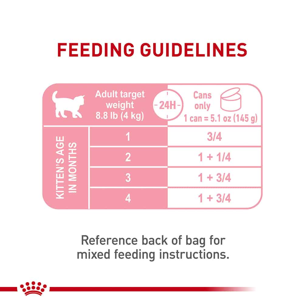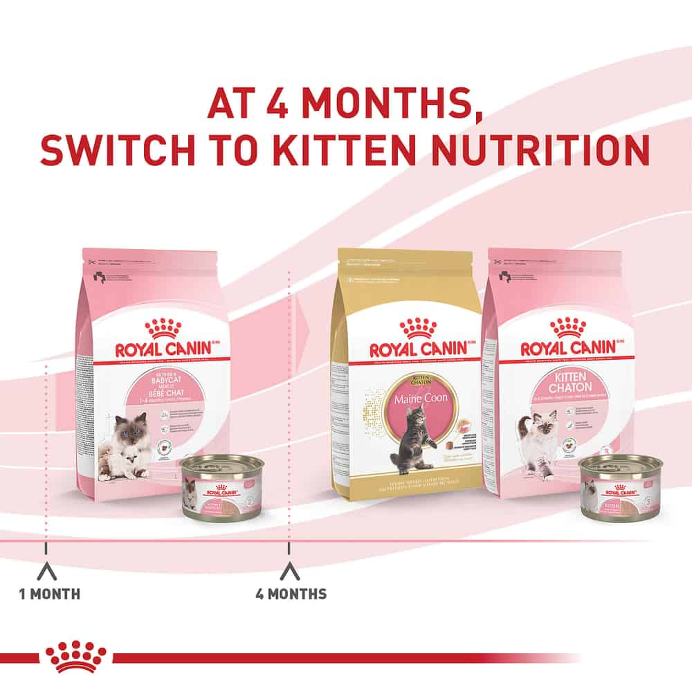 The canned pate cat food with an ultra-soft mousse texture facilitates the transition from milk to solid food for young kittens and their baby teeth. Plus, a combination of prebiotics and highly digestible proteins helps promote a healthy balance of intestinal microbiota for digestive health. Most kittens reach adulthood at 12 months, with the exception of larger breed kittens, like Maine Coons, at 15 months. Feed this formula for months 1 to 4, then switch your kitten to Royal Canin Feline Health Nutrition Kitten food to continue supporting their healthy growth. Help your baby kitten grow healthy and strong with Royal Canin Mother & Babycat Ultra-Soft Mousse in Sauce.