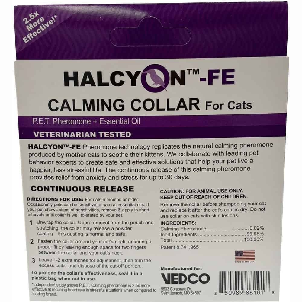 The Halcyon-Fe Calming Collar contains a unique proprietary pheromone (2M2B) that is clinically proven to be safe and effective in addressing a wide range of behavior issues in cats. The calming effects of the collar will last 30 days.