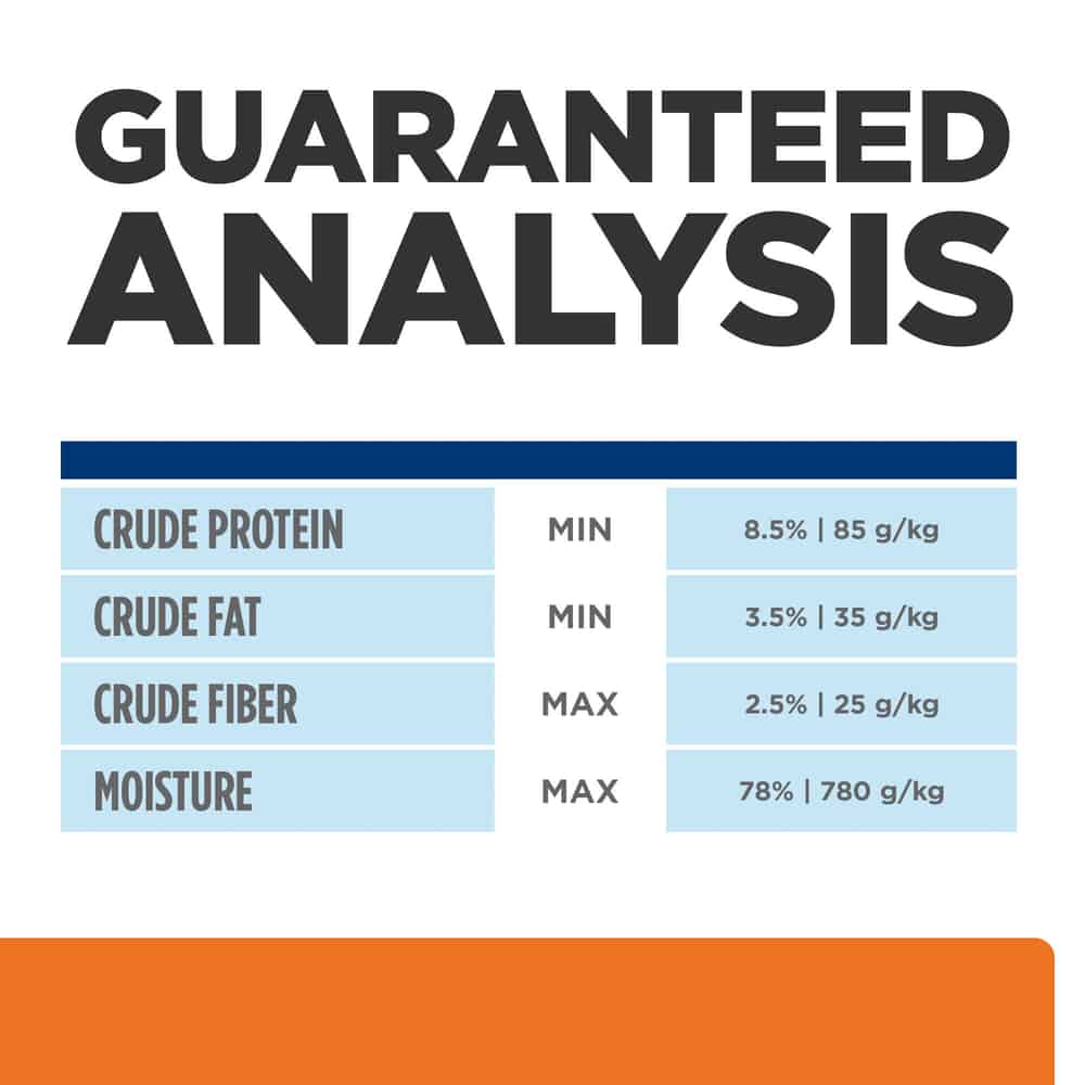 | Pork By-Products, Water, Pork Liver, Chicken, Brewers Rice, Corn Starch, Chicken Fat, Soybean Meal, Chicken Liver Flavor, Fish Oil, Hydrolyzed Chicken Flavor, Calcium Sulfate, Guar Gum, Brewers Dried Yeast, Choline Chloride, Calcium Chloride, DL-Methionine, vitamins (Vitamin E Supplement, Thiamine Mononitrate, Pyridoxine Hydrochloride, Niacin Supplement, Calcium Pantothenate, Vitamin B12 Supplement, Riboflavin Supplement, Biotin, Folic Acid, Vitamin D3 Supplement), Iodized Salt, Taurine, Potassium Citrate, Potassium Chloride, minerals (Zinc Oxide, Ferrous Sulfate, Manganese Sulfate, Copper Sulfate, Calcium Iodate), Beta-Carotene. |