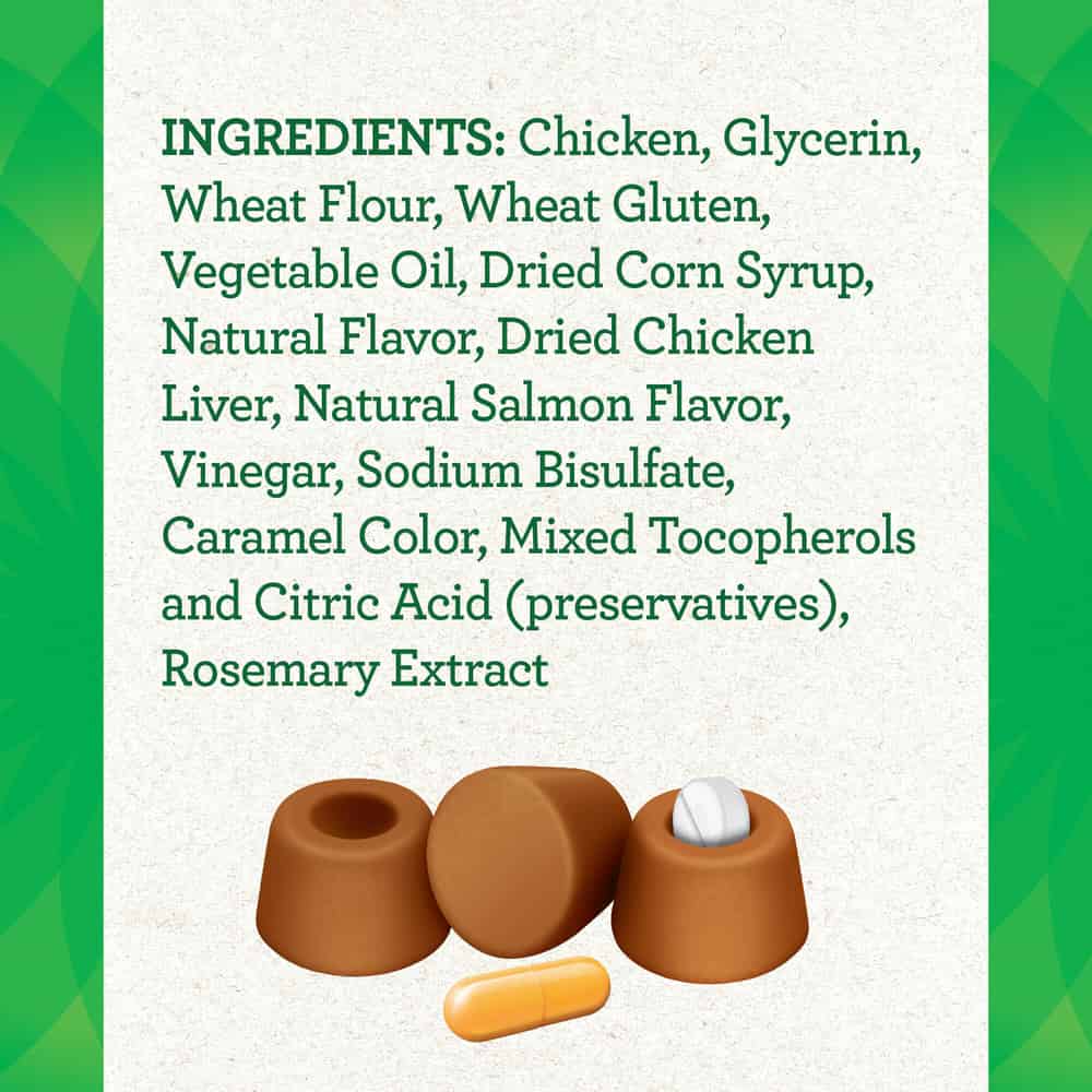 | Chicken, Glycerin, Wheat Flour, Wheat Gluten, Natural Salmon Flavor, Vegetable Oil, Dried Corn Syrup, Natural Flavor, Dried Cultured Skim Milk, Sodium Bisulfate, Mixed Tocopherols and Citric Acid (preservatives), Rosemary Extract. |
