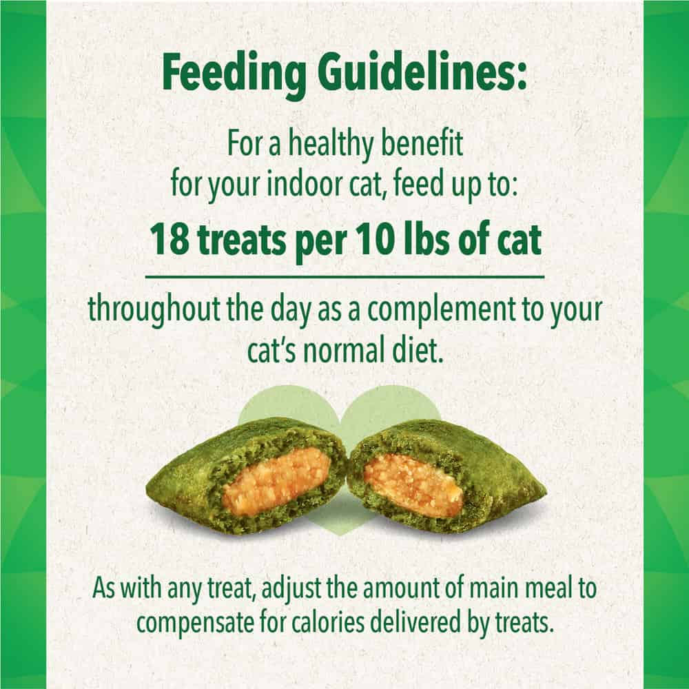 - For a healthy benefit for your indoor cat, feed 18 treats per 10 lbs of cat throughout the day.