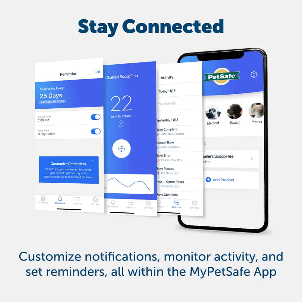 - App-Connected Litter Box - This litter box is connected to the My PetSafe app on your smart phone so you can monitor your cat’s health and her litter box from anywhere, even when you’re not home