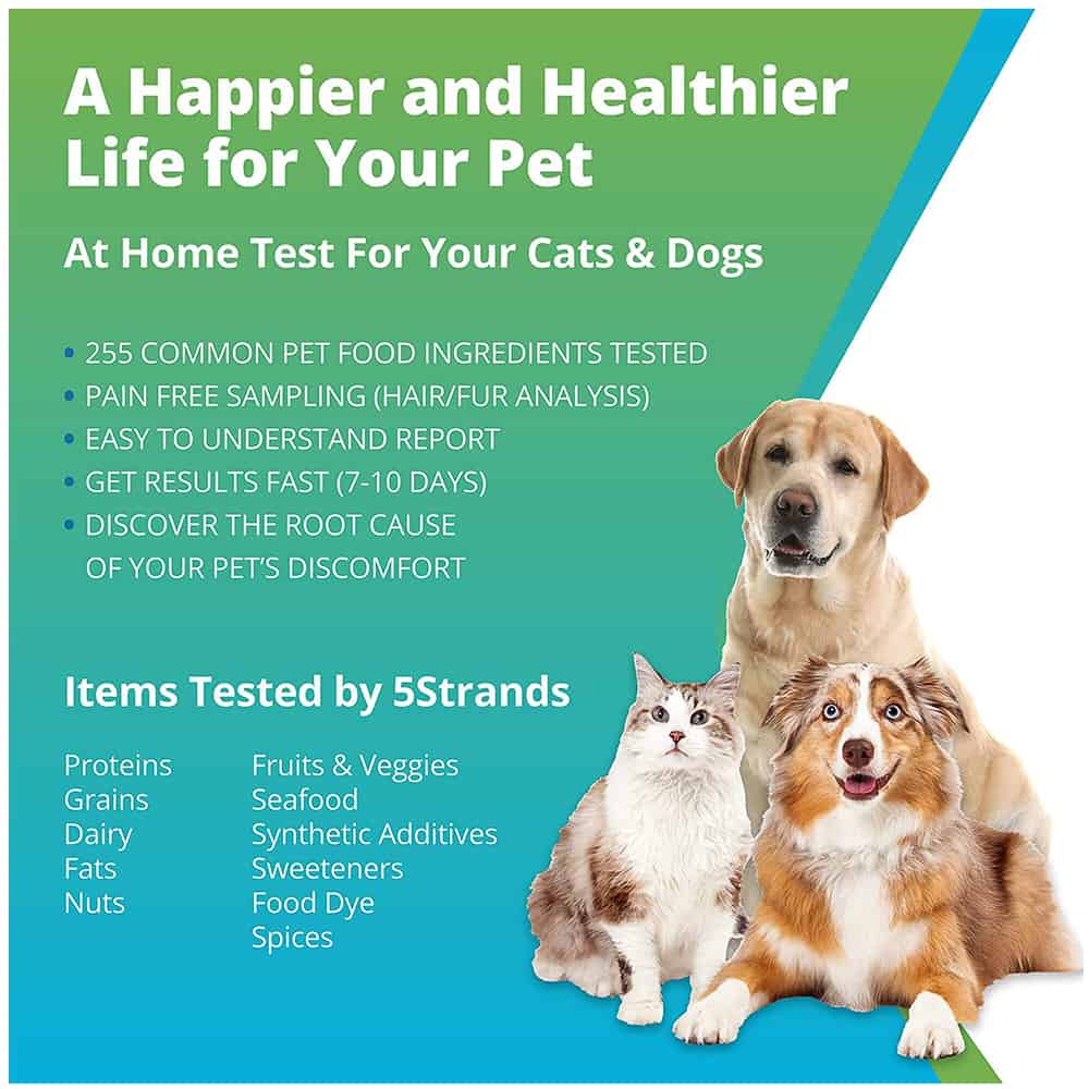 Pet Intolerance Test is an at-home allergy and intolerance test for cats and dogs. It can be used to detect intolerances to over 300 of the most common allergens, including proteins, seafood, fruits, veggies, insects, cleaning solutions, fabrics, plants, fungi, mold and more. Testing is done by 5Strands and results are sent via email 5-7 days after your sample arrives at the processing center.