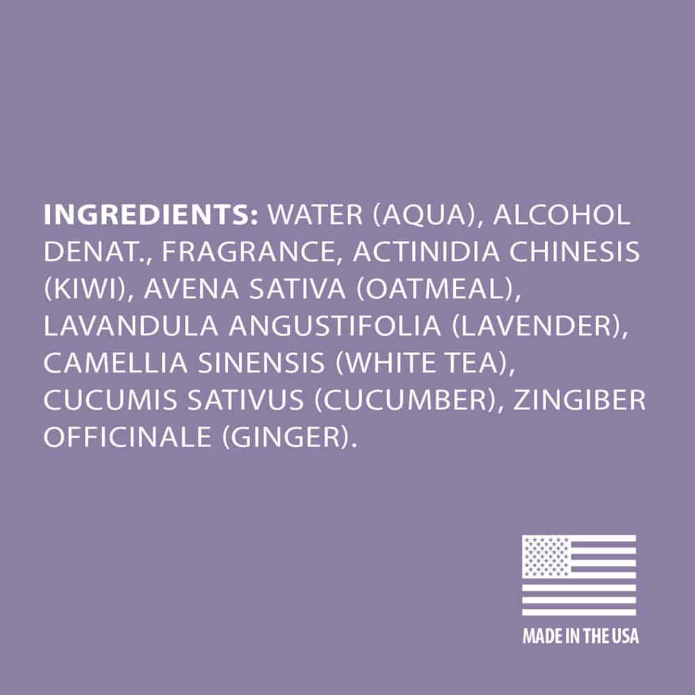 | Other Ingredients: Water (Aqua), Alcohol Denat., Fragrance, Actinidia Chinesis (Kiwi), Avena Sativa (Oatmeal), Lavandula Angustifolia (Lavender), Camellia Sinensis (White Tea), Cucumis Sativus (Cucumber), Zingiber Officinale (Ginger) |