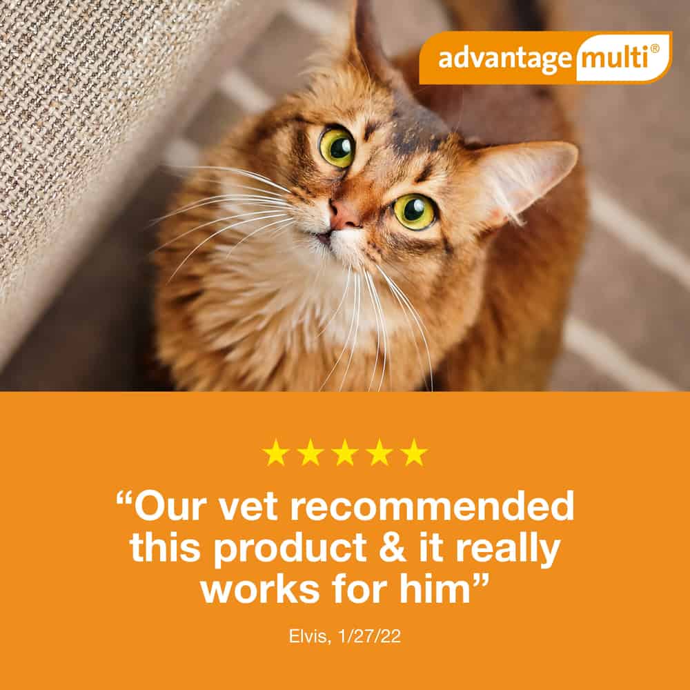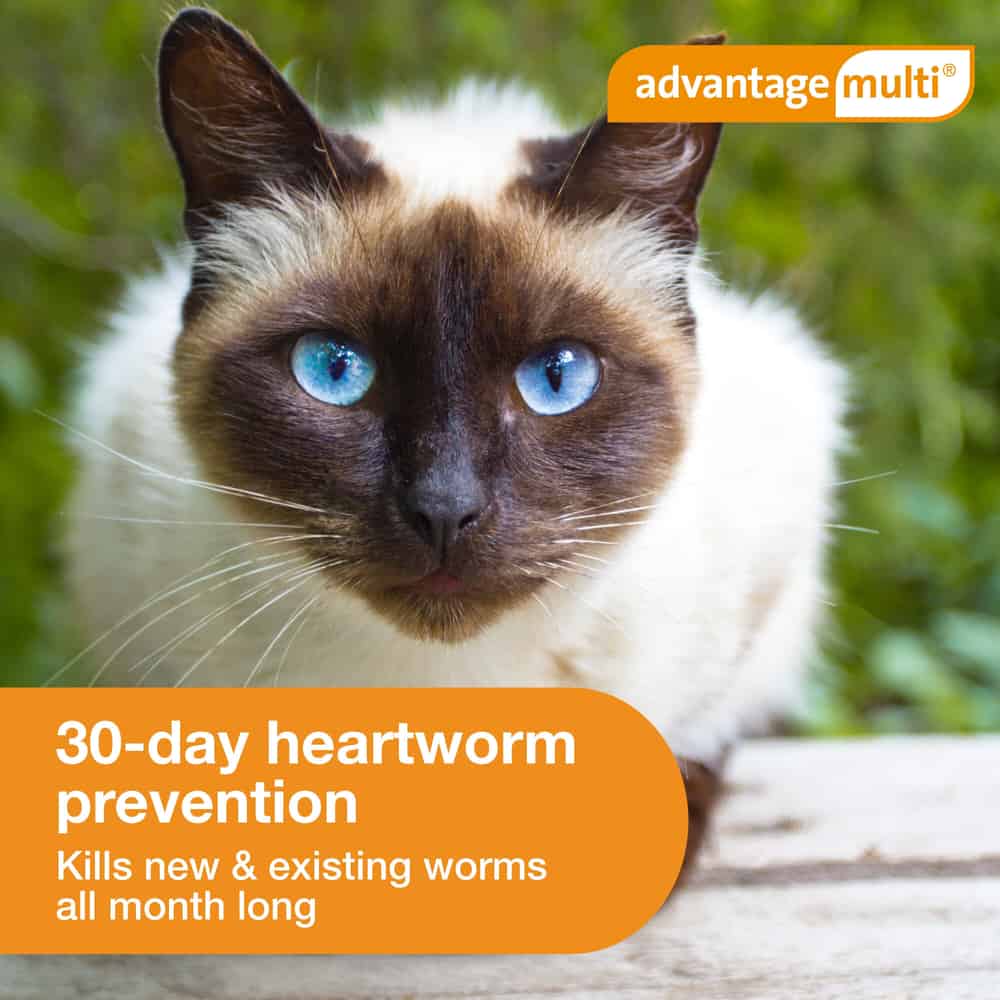 Advantage Multi for Cats kills adult fleas through contact meaning they don't have to bite and feed on your cat to die. It treats flea infestations as well as treats and controls the common occurring ear mite and intestinal parasites roundworms and hookworms. Advantage Multi for Cats prevents also heartworm disease, an often overlooked concern in cats. Additionally, Advantage Multi for Cats is also the first and only FDA-approved product to kill adult fleas, treat flea infestations, and prevent heartworm disease in ferrets.