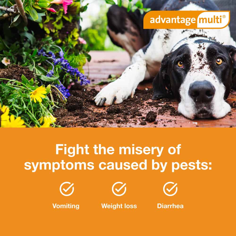 Advantage Multi for Dogs offers heartworm disease prevention that forgives if you forget. We all know how busy life can be and remembering to give heartworm protection on the same day every month can be a challenge. With Advantage Multi for Dogs, if you forget and go over 30 days between applications, just treat immediately and resume your monthly schedule. Advantage Multi for Dogs also kills adult fleas through contact, meaning they dont have to bite your dog to die. Additionally, the product treats flea infestations as well as 3 common intestinal parasites that infect and harm dogs (roundworms, hookworms, and whipworms). It also treats a very itchy skin mite called sarcoptes, which can infect people.