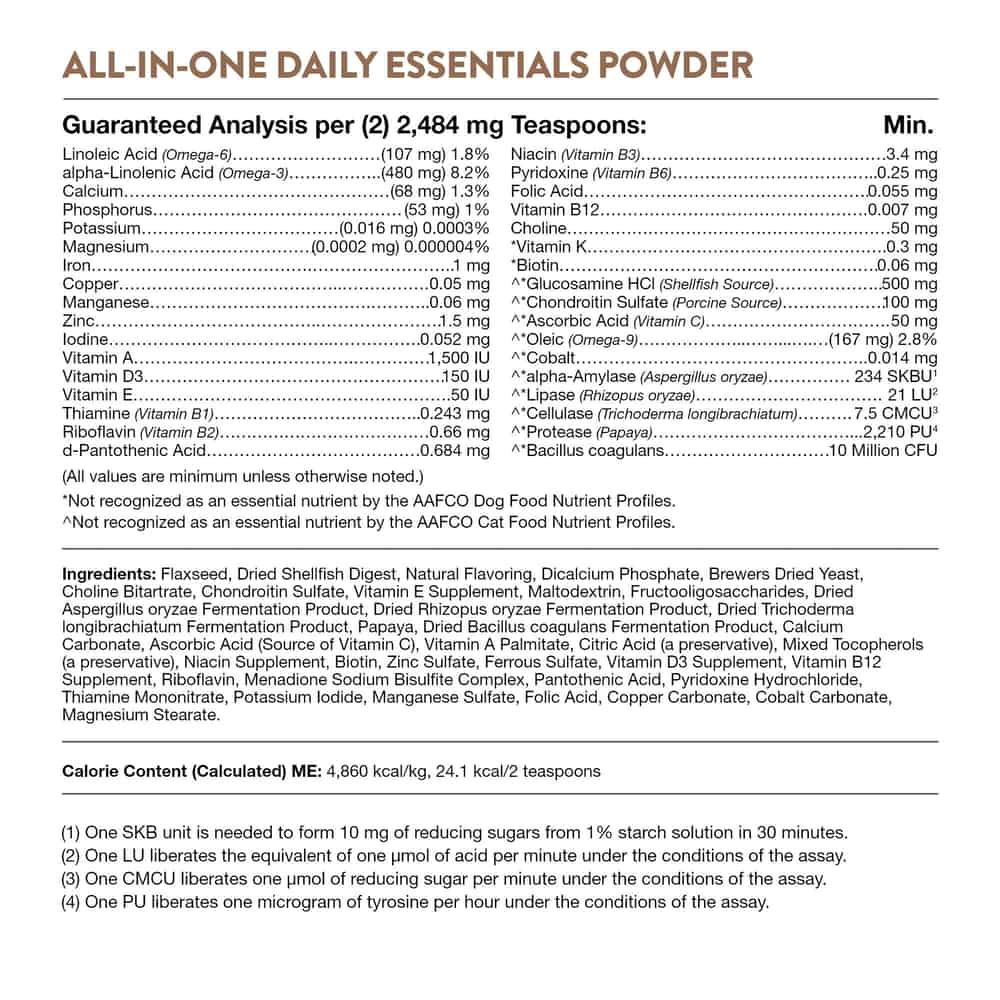 | Ingredients: Flaxseed, Dried Shellfish Digest, Natural Flavoring, Dicalcium Phosphate, Brewers Dried Yeast, Choline Bitartrate, Chondroitin Sulfate, Fructooligosaccharides, Dried Aspergillus oryzae Fermentation Product, Dried Aspergillus niger Fermentation Solubles, Dried Trichoderma longibrachiatum Fermentation Product, Papaya, Dried Bacillus coagulans Fermentation Product, Vitamin E Supplement, Calcium Carbonate, Ascorbic Acid (a Source of Vitamin C), Vitamin A Palmitate, Citric Acid (a preservative), Mixed Tocopherols (a preservative), Niacin Supplement, Biotin, Zinc Sulfate, Ferrous Sulfate, Pantothenic Acid, Vitamin D3 Supplement, Vitamin B12 Supplement, Riboflavin, Menadione Sodium Bisulfite Complex, Pyridoxine Hydrochloride, Thiamine Mononitrate, Potassium Iodide, Manganese Sulfate, Folic Acid, Copper Carbonate, Cobalt Carbonate, Magnesium Stearate | |