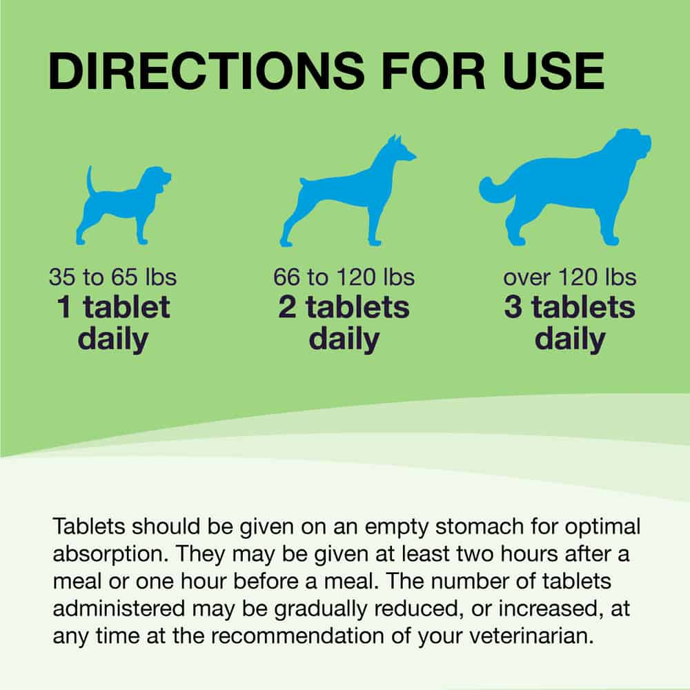 The tablets should be given on an empty stomach at least one hour before feeding. Research shows that, if possible, a fasting period of 8-12 hours before giving this product is optimal. The usual dose in cats and dogs is based on weight. For pets up to 12 lbs give 1 tablet of the 90mg strength, for pets 13 to 34 lbs give 1 tablet of the 225mg strength, for pets 35 to 65 lbs give 1 tablet of the 425mg strength, for pets 66 to 120 lbs give 2 tablets of the 425mg strength and for pets over 120 lbs give 3 tablets of the 425mg strength. When giving more than 1 tablet the total number of tablets may be divided into morning and evening. For example, a dose of 3 tablets could be divided into 2 tablets in the morning and 1 tablet in the evening.