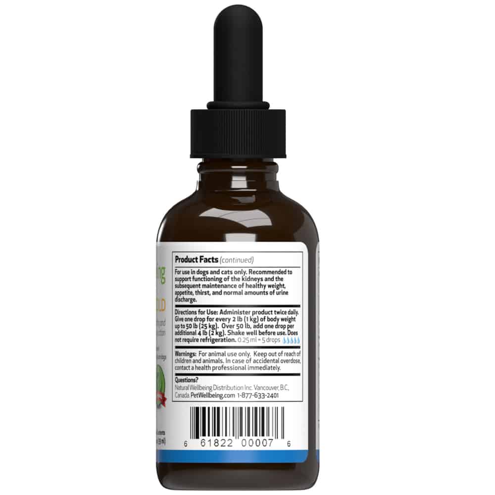 Pet Wellbeing Kidney Support Gold is an all-natural veterinarian-formulated supplement that promotes nephron health and fluid balance in pets with kidney disease.