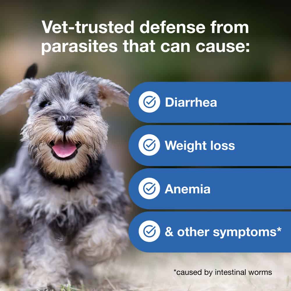 - Delivers protection for a full month *Heartworm, hookworm, roundworm, whipworm and tapeworm