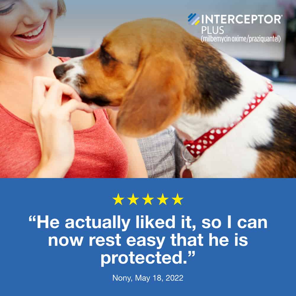 When untreated, intestinal worms can cause discomfort and fatigue with diarrhea, weight loss, anemia and more. That’s why Interceptor Plus makes dosing easy and convenient with 5-in-1 protection in a tasty, chicken-flavored chew. No need to hide pills in food-pockets. This chewable heartworm prevention goes down easy and keeps the protection going strong for a month.