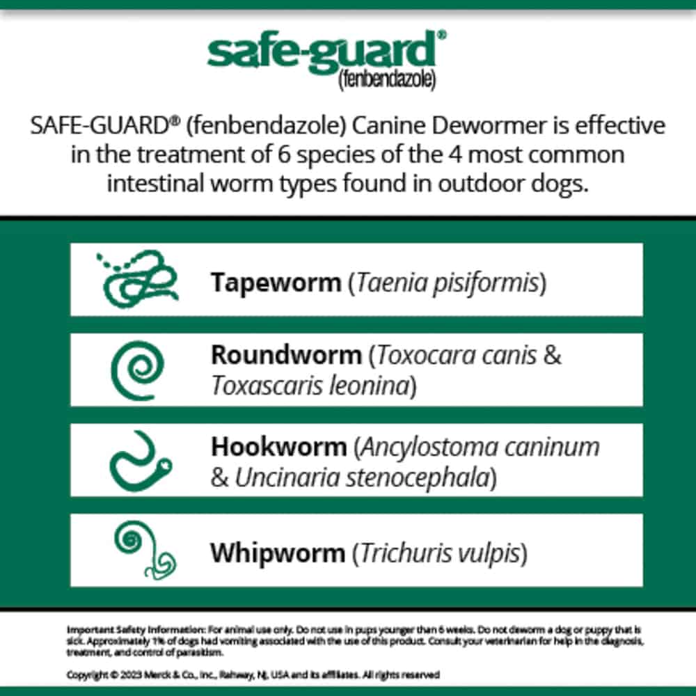 Safe-Guard Canine Dewormer contains active ingredient Fenbendazole to treat and control tapeworms, roundworms, hookworms, and whipworms.