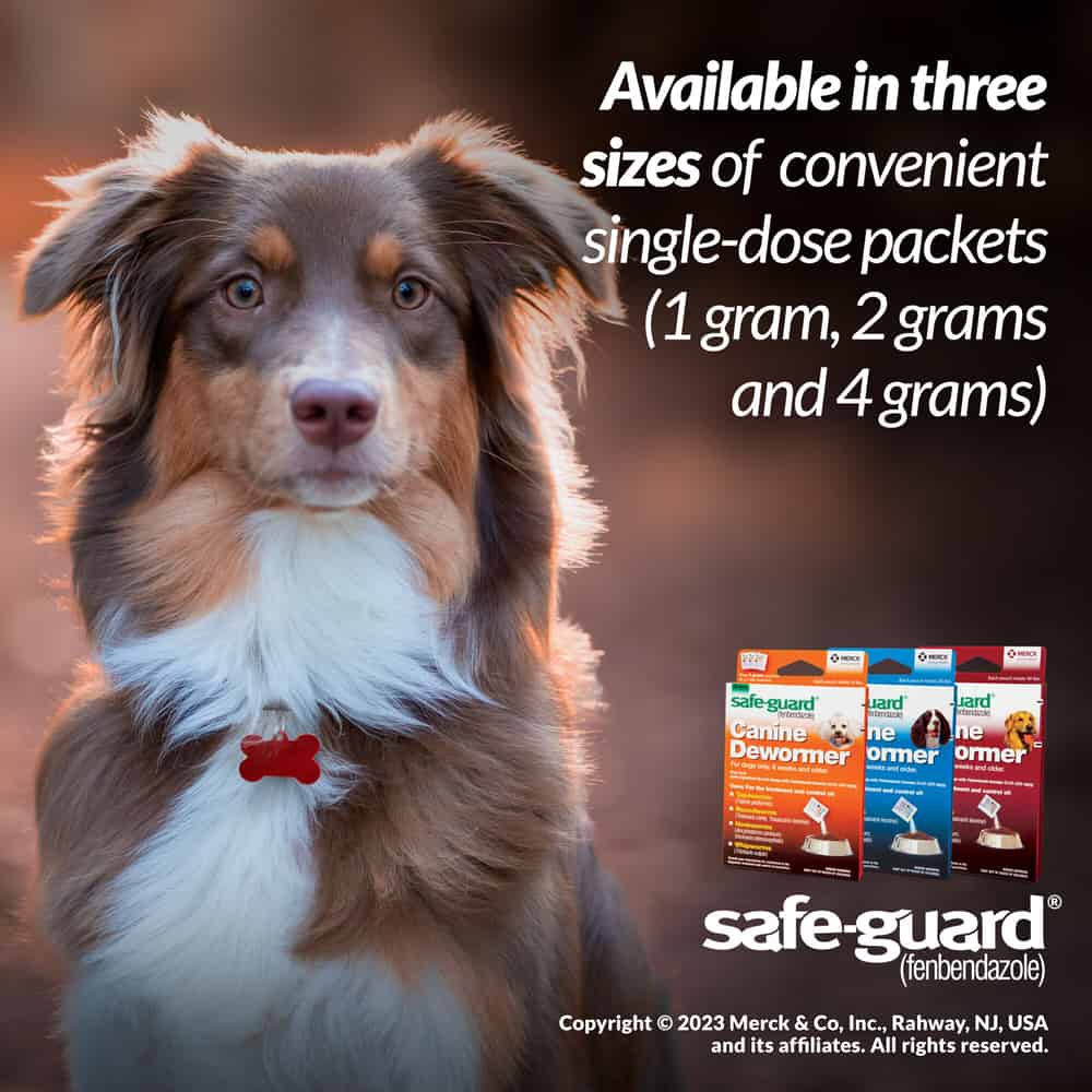 Safe-Guard Canine Dewormer is for the treatment and control of tapeworms, roundworms, hookworms, and whipworms in dogs and weaned puppies over 6 weeks of age. It's easy to administer; just mix with your dog's food. It is an ideal complement to monthly heartworm prevention products, which may not protect against all four major types of intestinal worms. Safe-Guard Canine Dewormer is safe to use in pregnant dogs.