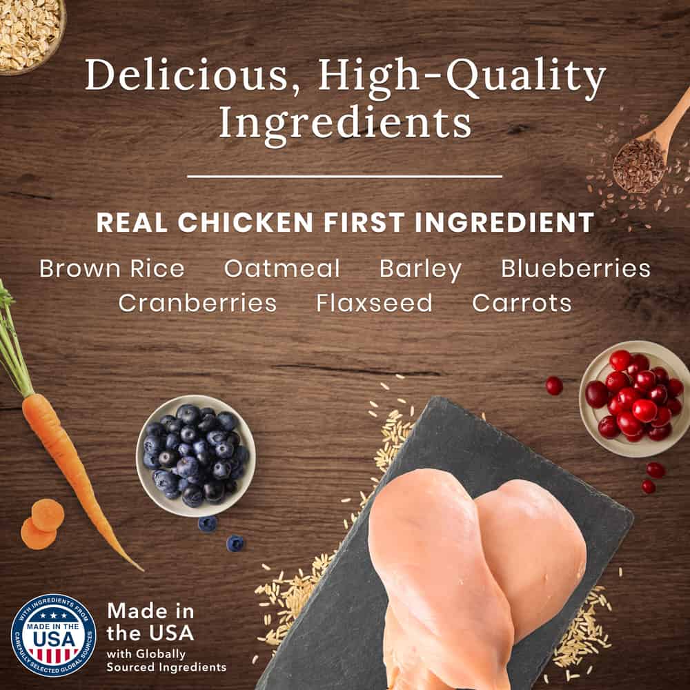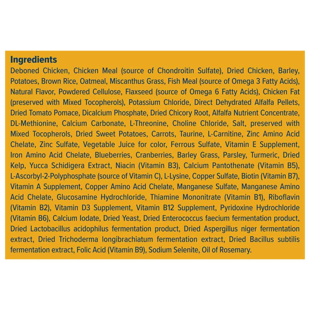 | Ingredients: Deboned Chicken, Chicken Meal (source of Chondroitin Sulfate), Dried Chicken, Oatmeal, Barley, Potatoes, Brown Rice, Fish Meal (source of Omega 3 Fatty Acids), Powdered Cellulose, Natural Flavor, Chicken Fat (preserved with Mixed Tocopherols), Flaxseed (source of Omega 6 Fatty Acids), Potassium Chloride, Direct Dehydrated Alfalfa Pellets, Dried Tomato Pomace, Dicalcium Phosphate, L-Threonine, Calcium Carbonate, Alfalfa Nutrient Concentrate, Dried Chicory Root, DL-Methionine, Choline Chloride, Salt, preserved with Mixed Tocopherols, Sweet Potatoes, Carrots, Taurine, L-Carnitine, Zinc Amino Acid Chelate, Zinc Sulfate, Vegetable Juice for color, Ferrous Sulfate, Vitamin E Supplement, Iron Amino Acid Chelate, Blueberries, Cranberries, Barley Grass, Parsley, Turmeric, Dried Kelp, Yucca Schidigera Extract, Niacin (Vitamin B3), Calcium Pantothenate (Vitamin B5), L-Ascorbyl-2-Polyphosphate (source of Vitamin C), L-Lysine, Copper Sulfate, Biotin (Vitamin B7), Vitamin A Supplement, Copper Amino Acid Chelate, Manganese Sulfate, Manganese Amino Acid Chelate, Glucosamine Hydrochloride, Thiamine Mononitrate (Vitamin B1), Riboflavin (Vitamin B2), Vitamin D3 Supplement, Vitamin B12 Supplement, Pyridoxine Hydrochloride (Vitamin B6), Calcium Iodate, Dried Yeast, Dried Enterococcus faecium fermentation product, Dried Lactobacillus acidophilus fermentation product, Dried Aspergillus niger fermentation extract, Dried Trichoderma longibrachiatum fermentation extract, Dried Bacillus subtilis fermentation extract, Folic Acid (Vitamin B9), Sodium Selenite, Oil of Rosemary | |
