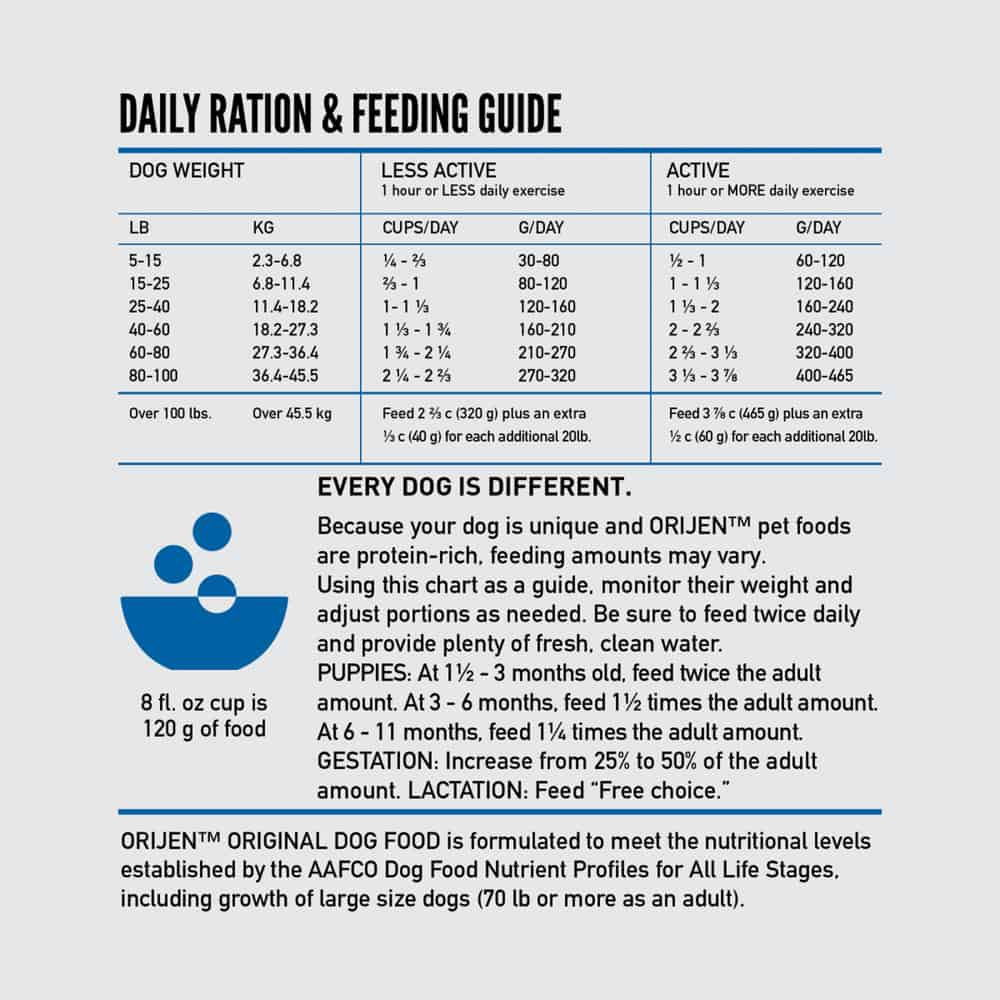 - Because your dog is unique and ORIJEN™ pet foods are packed with animal protein, feeding requirements will vary with breed, environment, age and activity.