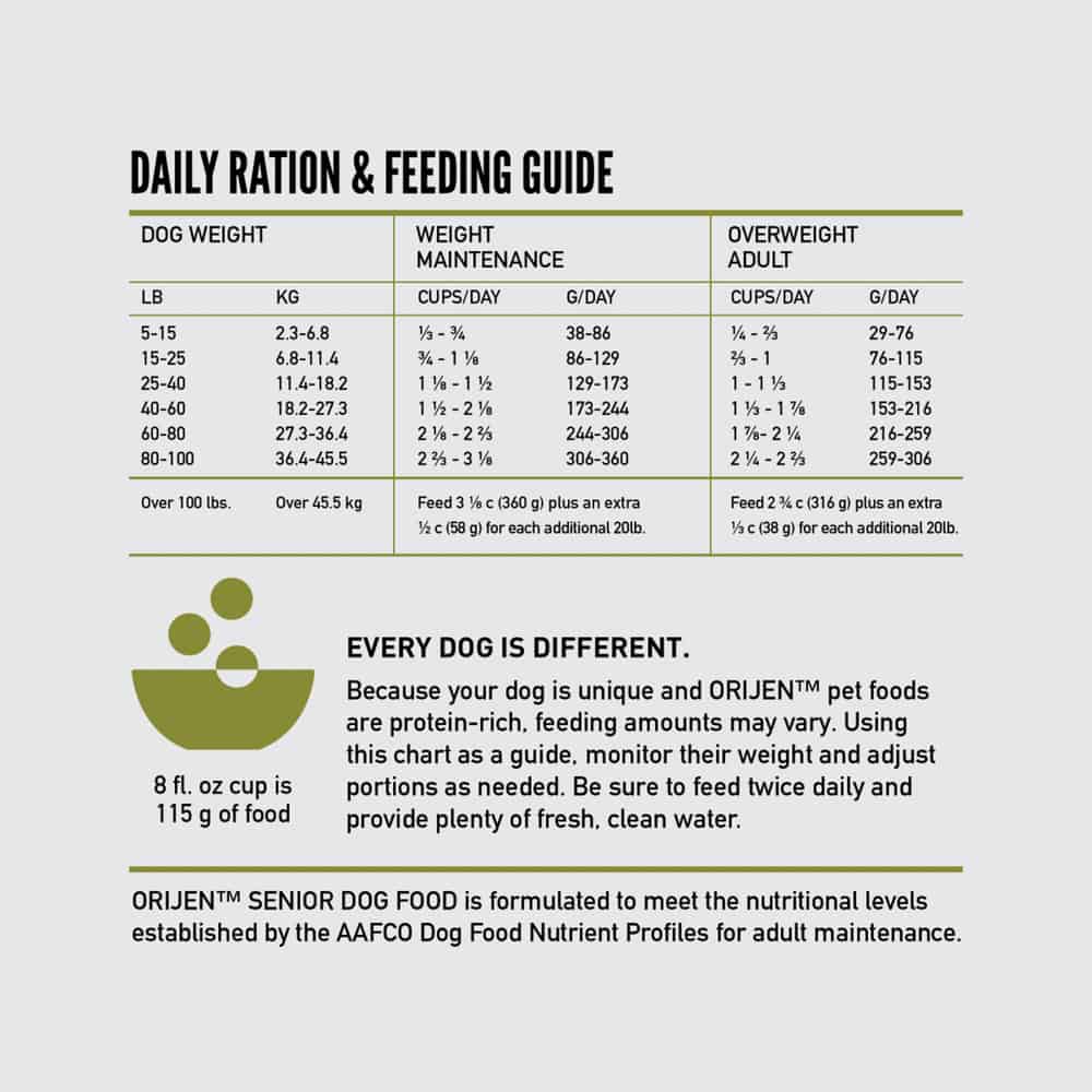 - Because your dog is unique and ORIJEN™ pet foods are packed with animal protein, feeding requirements will vary with breed, environment, age and activity.