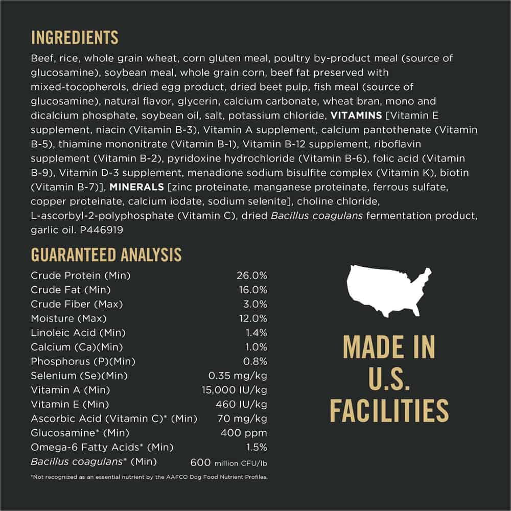 | Beef, Rice, Whole Grain Wheat, Corn Gluten Meal, Poultry By-product Meal (Source Of Glucosamine), Soybean Meal, Whole Grain Corn, Beef Fat Preserved With Mixed-tocopherols, Dried Egg Product, Dried Beet Pulp, Fish Meal (Source Of Glucosamine), Natural Flavor, Glycerin, Calcium Carbonate, Wheat Bran, Mono And Dicalcium Phosphate, Soybean Oil, Salt, Potassium Chloride, Vitamins [Vitamin E Supplement, Niacin (Vitamin B-3), Vitamin A Supplement, Calcium Pantothenate (Vitamin B-5), Thiamine Mononitrate (Vitamin B-1), Vitamin B-12 Supplement, Riboflavin Supplement (Vitamin B-2), Pyridoxine Hydrochloride (Vitamin B-6), Folic Acid (Vitamin B-9), Vitamin D-3 Supplement, Menadione Sodium Bisulfite Complex (Vitamin K), Biotin (Vitamin B-7)], Minerals [Zinc Proteinate, Manganese Proteinate, Ferrous Sulfate, Copper Proteinate, Calcium Iodate, Sodium Selenite], Choline Chloride, L-ascorbyl-2-polyphosphate (Vitamin C), Dried Bacillus Coagulans Fermentation Product, Garlic Oil. P446919 |