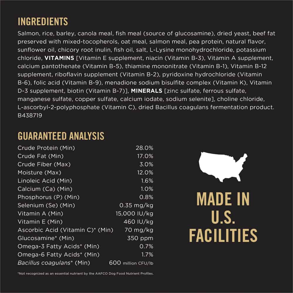 | Salmon, Barley, Rice, Oat Meal, Canola Meal, Fish Meal (Source Of Glucosamine), Beef Fat Preserved With Mixed-tocopherols, Salmon Meal (Source Of Glucosamine), Dried Yeast, Natural Flavor, Sunflower Oil, Chicory Root Inulin, Fish Oil, L-lysine Monohydrochloride, Salt, Potassium Chloride, Dl-methionine, Vitamins [Vitamin E Supplement, Niacin (Vitamin B-3), Vitamin A Supplement, Calcium Pantothenate (Vitamin B-5), Thiamine Mononitrate (Vitamin B-1), Vitamin B-12 Supplement, Riboflavin Supplement (Vitamin B-2), Pyridoxine Hydrochloride (Vitamin B-6), Folic Acid (Vitamin B-9), Menadione Sodium Bisulfite Complex (Vitamin K), Vitamin D-3 Supplement, Biotin (Vitamin B-7)], Calcium Carbonate, Minerals [Zinc Sulfate, Ferrous Sulfate, Manganese Sulfate, Copper Sulfate, Calcium Iodate, Sodium Selenite], Choline Chloride, L-ascorbyl-2-polyphosphate (Vitamin C), Dried Bacillus Coagulans Fermentation Product. L444919 |
