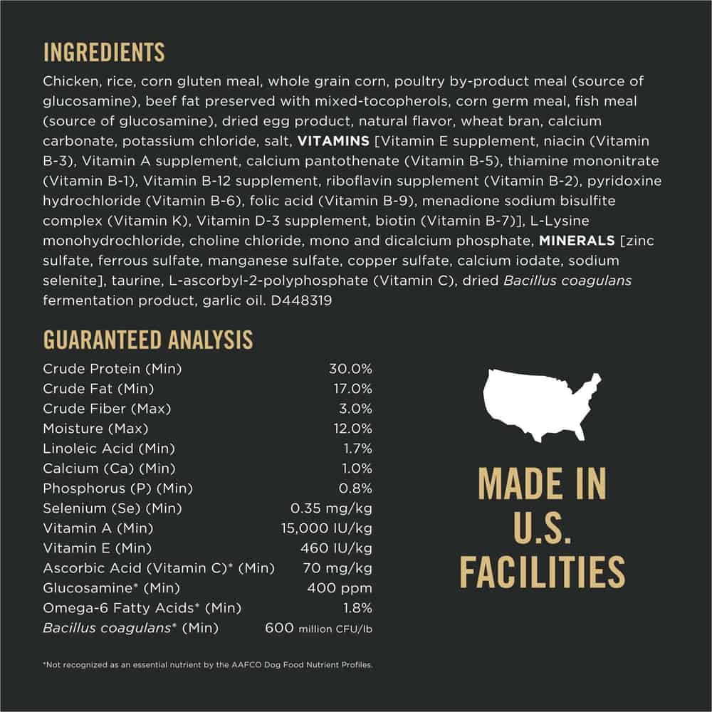 | Chicken, Rice, Corn Gluten Meal, Whole Grain Corn, Poultry By-product Meal (Source Of Glucosamine), Beef Fat Preserved With Mixed-tocopherols, Corn Germ Meal, Fish Meal (Source Of Glucosamine), Dried Egg Product, Natural Flavor, Wheat Bran, Calcium Carbonate, Potassium Chloride, Salt, Vitamins [Vitamin E Supplement, Niacin (Vitamin B-3), Vitamin A Supplement, Calcium Pantothenate (Vitamin B-5), Thiamine Mononitrate (Vitamin B-1), Vitamin B-12 Supplement, Riboflavin Supplement (Vitamin B-2), Pyridoxine Hydrochloride (Vitamin B-6), Folic Acid (Vitamin B-9), Menadione Sodium Bisulfite Complex (Vitamin K), Vitamin D-3 Supplement, Biotin (Vitamin B-7)], L-lysine Monohydrochloride, Choline Chloride, Mono And Dicalcium Phosphate, Minerals [Zinc Sulfate, Ferrous Sulfate, Manganese Sulfate, Copper Sulfate, Calcium Iodate, Sodium Selenite], Taurine, L-ascorbyl-2-polyphosphate (Vitamin C), Dried Bacillus Coagulans Fermentation Product, Garlic Oil. D448319 |