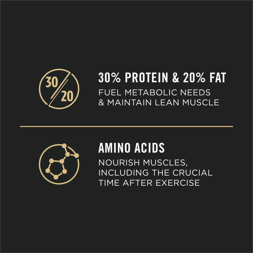 Purina Pro Plan SPORT Performance 30/20 All Life Stage recipe concentrates nutrition in ways that help optimize oxygen metabolism for increased endurance. This formula contains a blend of 30 percent protein and 20 percent fat to assist in caring for your dog's metabolic needs, as well as to help them maintain lean, strong muscles. Amino acids nourish your dog's muscles, especially in those critical moments after your dog has been working or training hard. EPA and glucosamine help support joint health and mobility to make running, jumping, crouching and other movements as easy for your dog as possible. The tasty, antioxidant-rich recipe doesn't just fuel your dog's body; it also nourishes his immune system.
