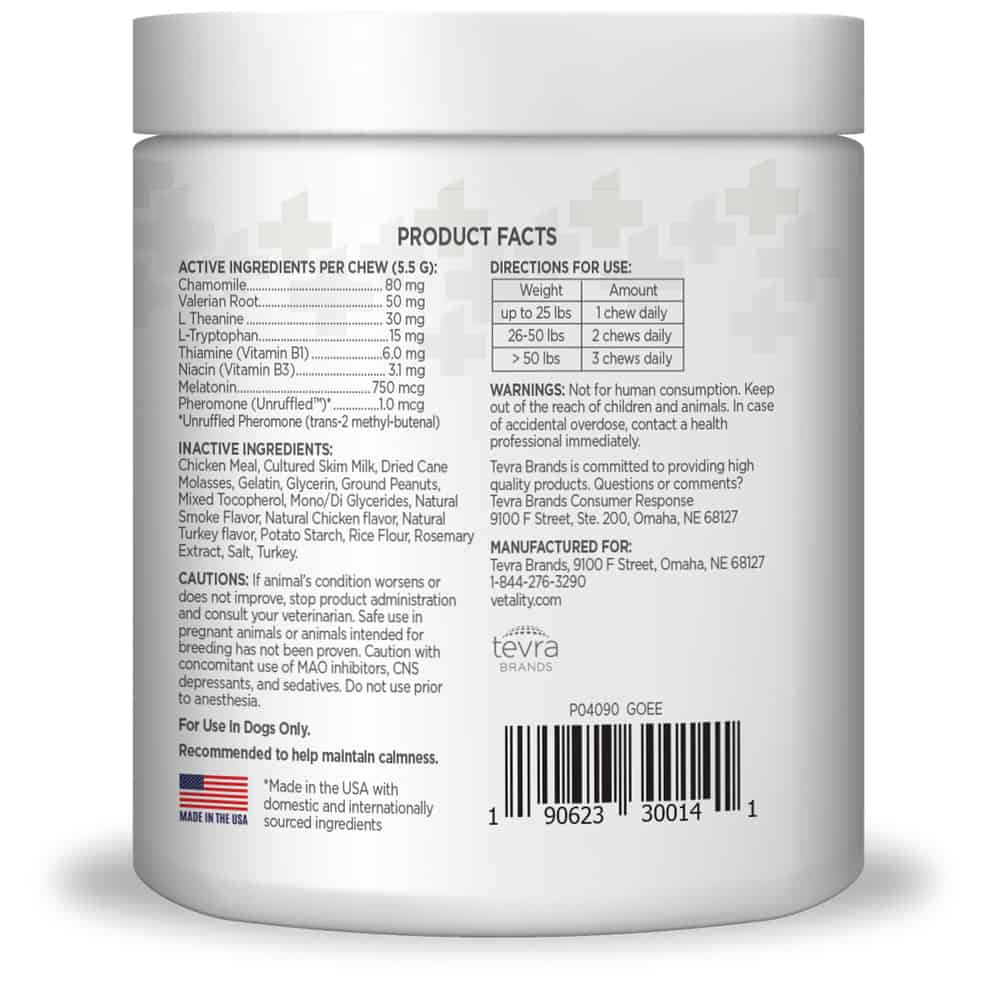 TevraPet Triple Action Calming Sniffer Soft Chews contains a patented pheromone to help reduce stress which may cause inappropriate behaviors in dogs. It can help dogs focus, which makes for a great training tool. Additionally, TevraPet Triple Action Calming Sniffer Soft Chews contains l-tryptophan, an amino acid that works in the brain to support stress response and act as a mood booster, which helps keep dogs calm in stressful situations such as traveling, thunderstorms, and fireworks. It also contains thiamine and niacin, which can help reduce unwanted behaviors in dogs.
