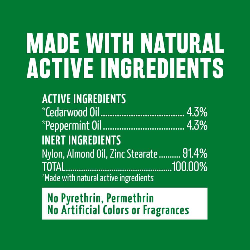 | Active Ingredients: Cedarwood Oil 4.3%, Peppermint Oil 4.3%. Inert Ingredients: Nylon, Zinc Stearate, Almond Oil 91.4%. TOTAL: 100% |
