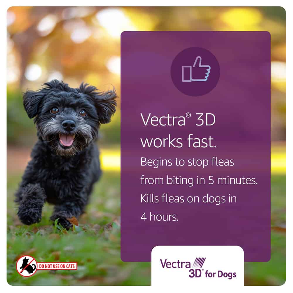 Vectra 3D is meant for use only in dogs and puppies over 8 weeks of age. Do not use on cats, and keep out of reach of children. If there is a cat in the household, make sure to separate your cat from your treated dog for 24 hours. Also, don't allow children to have contact with treated areas until the applicated areas are completely dry. Do not get into eyes or on clothing and avoid contact with skin. Do not use Vectra 3D on debilitated, aged, medicated, pregnant or nursing dogs, or dogs known to be sensitive to pesticide products without first consulting a veterinarian.
