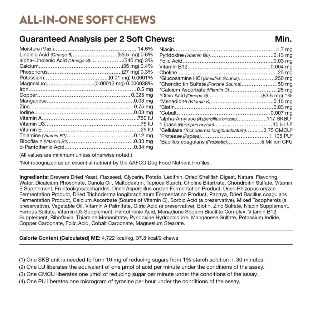 | Ingredients: Brewers Dried Yeast, Flaxseed, Glycerin, Dried Potato Product, Lecithin, Dried Shellfish Digest, Water, Dicalcium Phosphate, Canola Oil, Natural Flavoring, Maltodextrin, Tapioca Starch, Choline Bitartrate, Chondroitin Sulfate, Vitamin E Supplement, Fructooligosaccharides, Dried Aspergillus oryzae Fermentation Product, Dried Rhizopus oryzae Fermentation Product, Dried Trichoderma longibrachiatum Fermentation Product, Papaya, Dried Bacillus coagulans Fermentation Product, Calcium Ascorbate (Source of Vitamin C), Sorbic Acid (a preservative), Mixed Tocopherols (a preservative), Vegetable Oil, Vitamin A Palmitate, Citric Acid (a preservative), Biotin, Zinc Sulfate, Niacin Supplement, Ferrous Sulfate, Vitamin D3 Supplement, Pantothenic Acid, Menadione Sodium Bisulfite Complex, Vitamin B12 Supplement, Riboflavin, Thiamine Mononitrate, Pyridoxine Hydrochloride, Manganese Sulfate, Potassium Iodide, Copper Carbonate, Folic Acid, Cobalt Carbonate, Magnesium Stearate | |