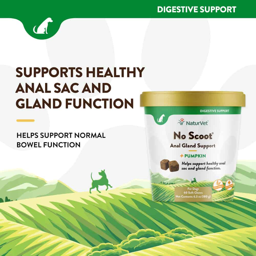 NaturVet No Scoot Plus Pumpkin Soft Chews for Dogs support healthy anal gland function and normal bowel function in dogs over 12 weeks of age. These tasty soft chews are easy to give your pet daily.