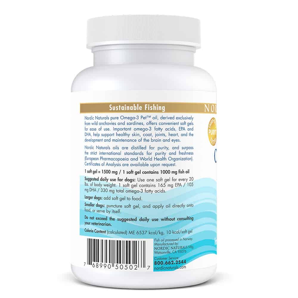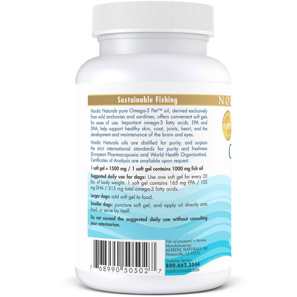 Nordic Naturals Omega-3 Pet is an exceptionally pure, fresh source of the important Omega-3 fatty acids. It comes in an easy to administer capsule without a strong fishy smell or taste. Omega-3 fatty acids support healthy cells, skin and coat, joints, heart, brain, eyes and energy levels for your dog. Omega-3 Pet uses the same oils and quality standards as Nordic Naturals human products. Derived exclusively from wild anchovies and sardines from the South Pacific Ocean off the coast of Peru. In 2008, the sustainability of these Peruvian fisheries was ranked as number one in the world. It exceeds stringent quality standards for purity and freshness.