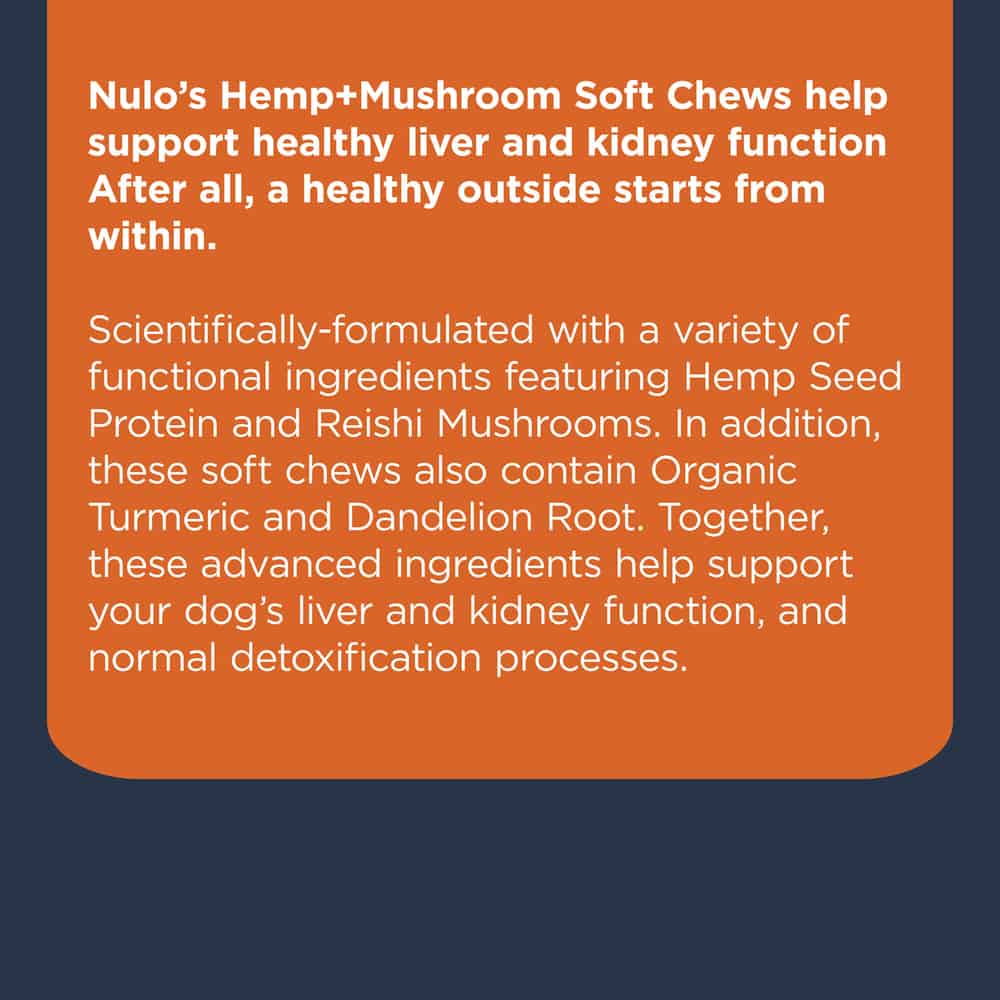 Nulo's Hemp & Mushroom Soft Chews help support healthy liver and kidney function for your dog.