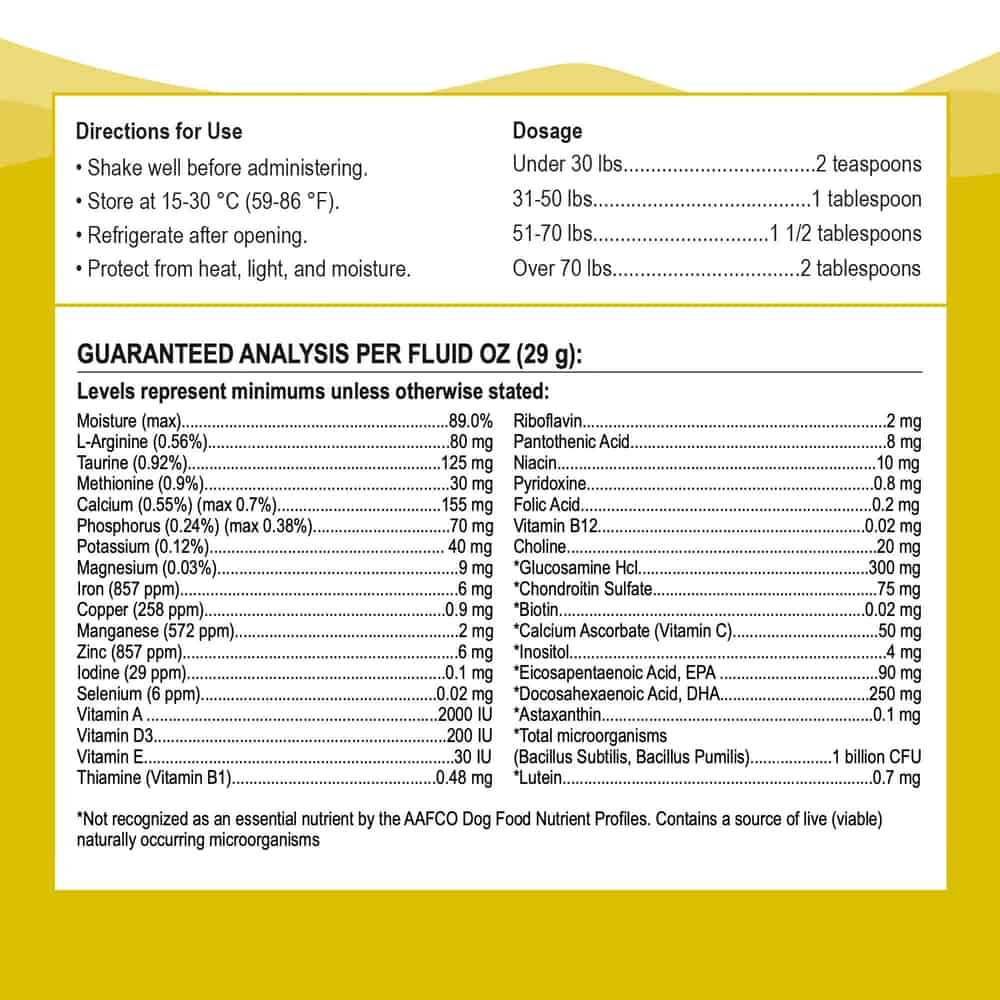 | Purified Water, Lecithin, Collagen, Molasses, Natural Meat Flavors, Xanthan Gum, Pectin, Citric Acid, Potassium Benzoate, Potassium Sorbate, Vitamin A, Vitamin B Complex (B-1, B-2, B-3, B-5, B-6, B-12, Folic Acid, Biotin, Choline, Inositol, PABA), Ester C, Vitamin D, Vitamin E, Vitamin K, Coenzyme Q10, Calcium, Copper, Iodine, Chromium, Iron, Magnesium, Manganese, Chloride, Silicon, Molybdenum, Phosphorus, Potassium, Zinc, Sodium, Lutein, Cobalt, Selenium, Glucosamine, MSM, Aloe Vera Seaweed Blend (Bladderwrack, Alaria Valida, Costaria Costata, Fucus Gardneri, Gigartina, Laminaria, Nereocystis, Ulva Latuca, Ulva Linza), Honey, Apple Cider Vinegar, Fatty Acids (Linoleic Acid) (Borage Oil and Pumpkin Seed), Alanine, Arginine, Aspartic Acid, Cystine, Glutamic Acid, Glycine, Histidine, Isoleucine, Leucine, Lysine, Methionine, Phenylalanine, Proline, Serine, Threonine, Tyrosine, Valine, Proprietary Blend (Black Walnut Powder, Grapefruit Seed Extract, Eyebright Powder, Broccoli Powder, Bilberry Powder, Grape Seed Extract), 63 Trace Minerals, Amylase, Lipase, Protease. |