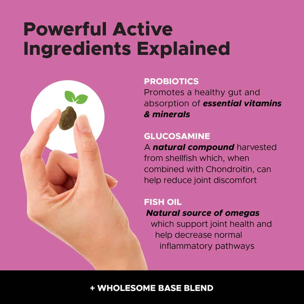 | Ingredients: Glucosamine HCl, Omega-3 Fish Oil, Multifunction Blend - Vitamin A, Vitamin D3, Niacin, d-Alpha tocopherol acetate (Vitamin E), Thiamin (B1), Pantothenic Acid, Pyridoxine (B6), Riboflavin (B2), Folic Acid, Biotin, Vitamin B-12), Chondroitin Sulfate, Vitamin C (Stay-C®), Balanced Kollagen® (Eggshell Membrane), Manganese Proteinate, Zinc Proteinate, Bacillus Coagulans, Bacillus Subtilis, Lactobacillus acidophilus, Lactococcus lactis, Lactobacillus plantarum, Lactobacillus fermentum, Lactobacillus brevis, Carrot, Coconut Glycerin, Flaxseed, Mixed Tocopherols, Natural Chicken Flavor, Natural Flavor (from Oregano, Plums, Flaxseed), Oat Flour, Palm Fruit Oil, Powdered Cellulose, Pumpkin, Rosemary Extract, Sunflower Lecithin, Sweet Potato | |