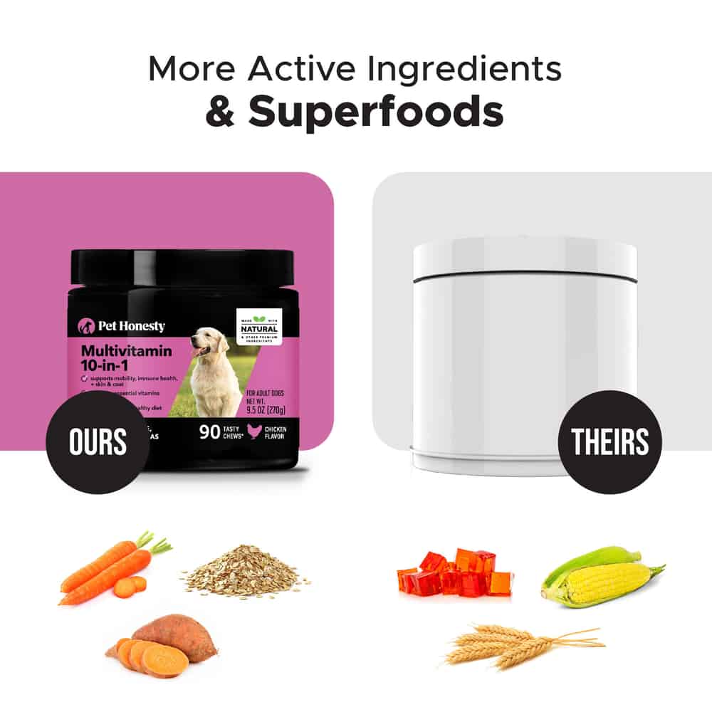 Pet Honesty Multivitamin 10-in-1 Chicken Flavored Soft Chews Daily Vitamin Supplement contains omega fatty acids and glucosamine to help support a normal inflammatory response and support bone and joint health, as well as probiotics to help maintain healthy digestion, promote a healthy gut, and encourage nutrient absorption.