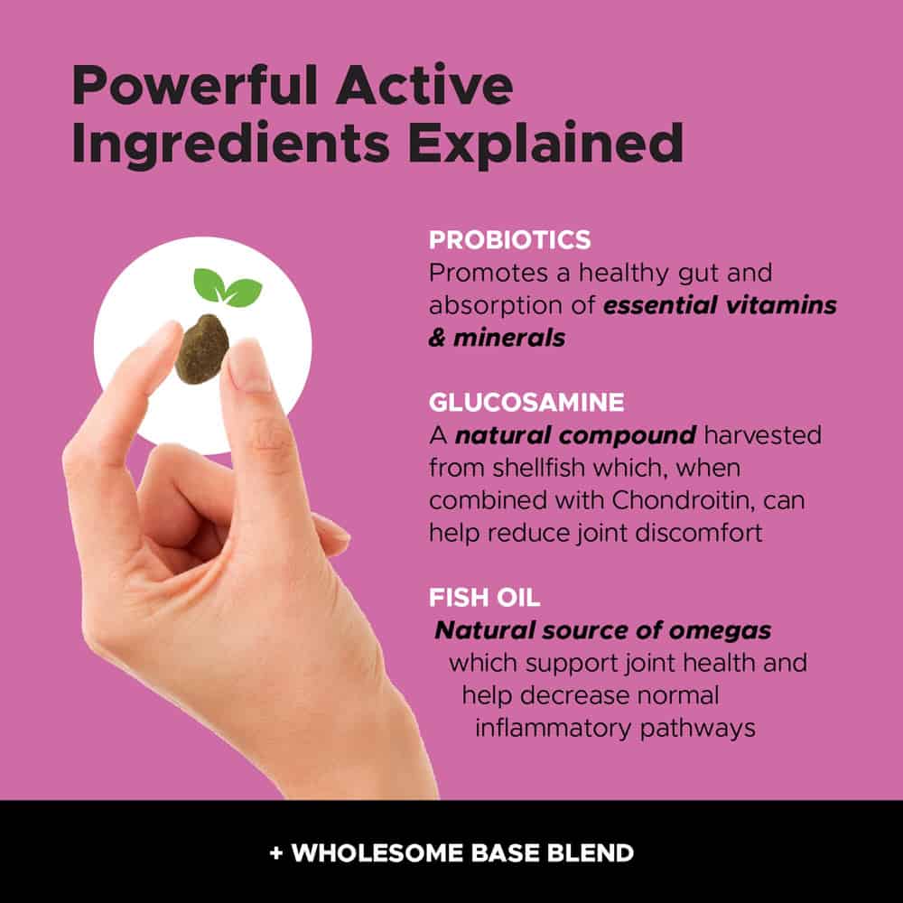 | Ingredients: Oat Flour, Peanut Flour, Ground Flaxseed, Sweet Potato Powder, Palm Oil, Pumpkin Powder, Carrot Powder, Glucosamine Hydrochloride, Powdered Cellulose, Sunflower Lecithin, Vitamin Blend (Niacin Supplement, Vitamin E Supplement, Vitamin A Supplement, Thiamine Mononitrate, Pyridoxine Hydrochloride, d-Calcium Pantothenate, Riboflavin Supplement, Vitamin D3 Supplement, Biotin, Vitamin B12 Supplement, Folic Acid), L-Ascorbyl-2-Polyphosphate, Fish Oil, Chondroitin Sulfate, Natural Peanut Butter Flavor, Coconut Glycerin, Natural Flavor, Dried Chicken Cartilage, Eggshell Meal, Dried Bacillus subtilis Fermentation Product, Dried Bacillus coagulans Fermentation Product, Manganese Proteinate, Dried Lactococcus lactis Fermentation Product, Dried Lactobacillus plantarum Fermentation Product, Dried Lactobacillus acidophilus Fermentation Product, Dried Lactobacillus fermentum Fermentation Product, Dried Lactobacillus brevis Fermentation Product, Citric Acid (Preservative), Mixed Tocopherols (Preservative), Rosemary Extract, and Zinc Proteinate. | |