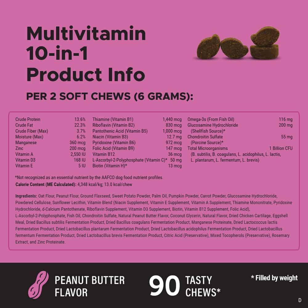 Pet Honesty Multivitamin 10-in-1 Peanut Butter Flavored Soft Chews Daily Vitamin Supplement for Dogs Ingredients: