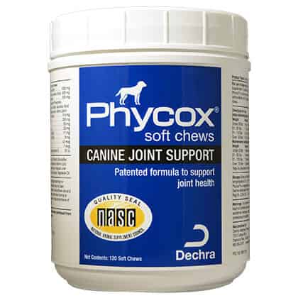 Phycox® is a joint supplement to help reduce inflammation and discomfort due to normal daily activity. It is available as Phycox Soft Chews, Phycox HypoAllergenic Soft Chews, Phycox Small Bites for small dogs under 30 lbs, and Phycox Granules. Each formulation of Phycox contains a natural source of phycocyanin, an extract of blue-green algae offering joint support and stress relief. If your dog has allergies, use Phycox HA HypoAllergenic, which contains no mammalian protein (no natural liver flavor).