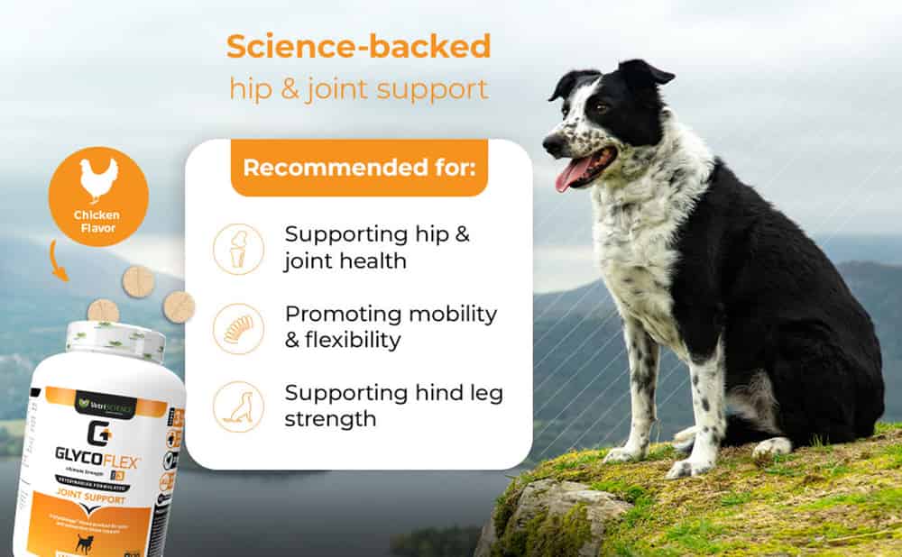 GlycoFlex 3 combines 11 active ingredients, including Perna canaliculus, glucosamine, MSM, and antioxidants, to support your dog’s joints and connective tissue. Made with natural ingredients in a chicken-flavored chewable tablet.