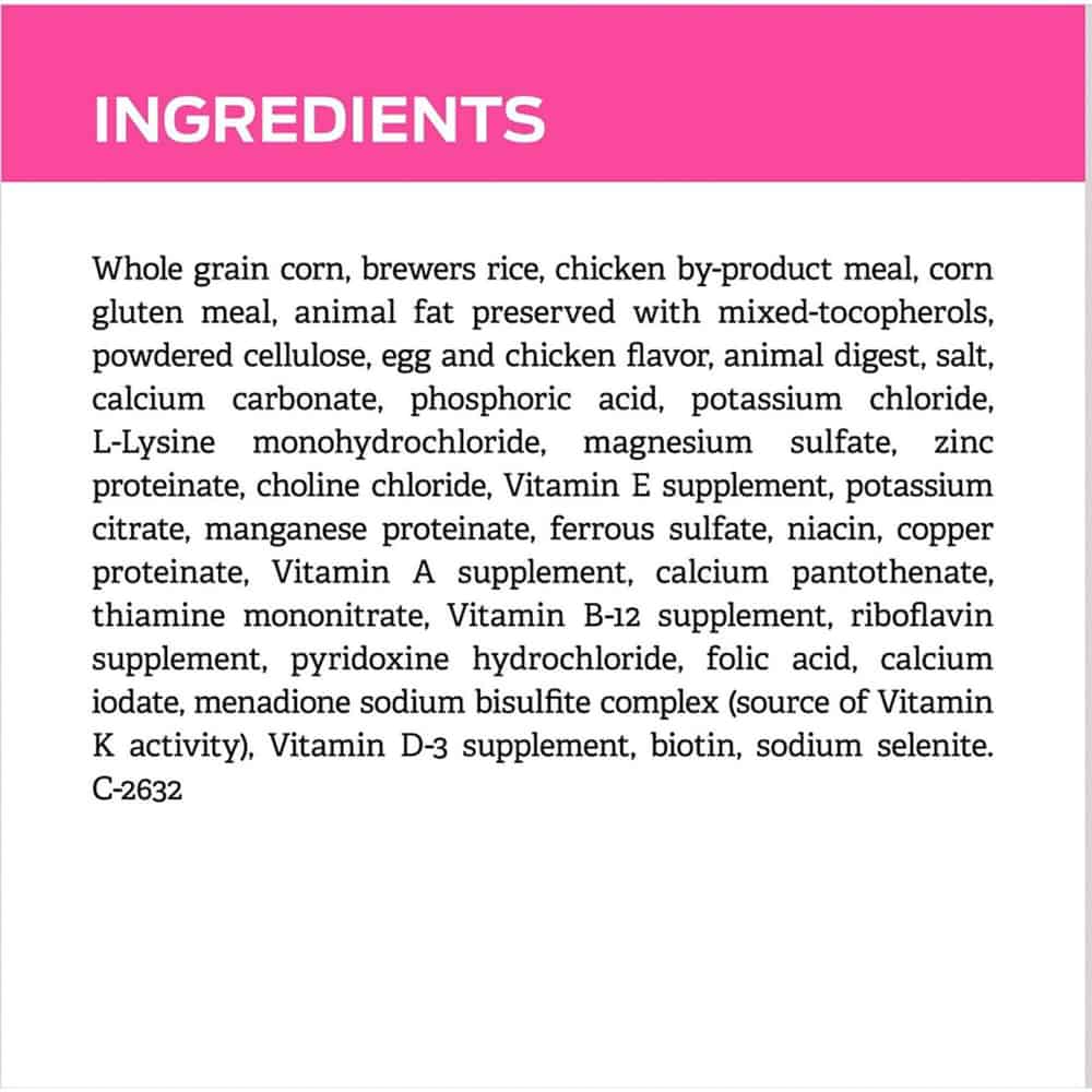 | Whole Grain Corn, Brewers Rice, Chicken By-Product Meal, Corn Gluten Meal, Animal Fat Preserved With Mixed-Tocopherols, Powdered Cellulose, Egg And Chicken Flavor, Animal Digest, Salt, Calcium Carbonate, Phosphoric Acid, Potassium Chloride, L-Lysine Monohydrochloride, Magnesium Sulfate, Zinc Proteinate, Choline Chloride, Vitamin E Supplement, Potassium Citrate, Manganese Proteinate, Ferrous Sulfate, Niacin, Copper Proteinate, Vitamin A Supplement, Calcium Pantothenate, Thiamine Mononitrate, Vitamin B-12 Supplement, Riboflavin Supplement, Pyridoxine Hydrochloride, Folic Acid, Calcium Iodate, Menadione Sodium Bisulfite Complex (Source Of Vitamin K Activity), Vitamin D-3 Supplement, Biotin, Sodium Selenite. C-2632. |