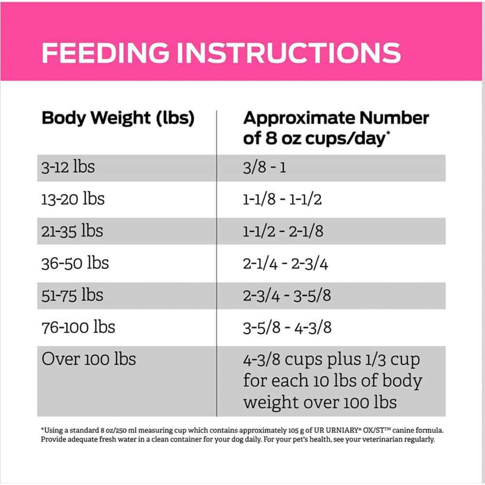 Use a standard 8 oz/250 ml measuring cup for approximately 115 g of UR Urinary OX/ST canine formula.
