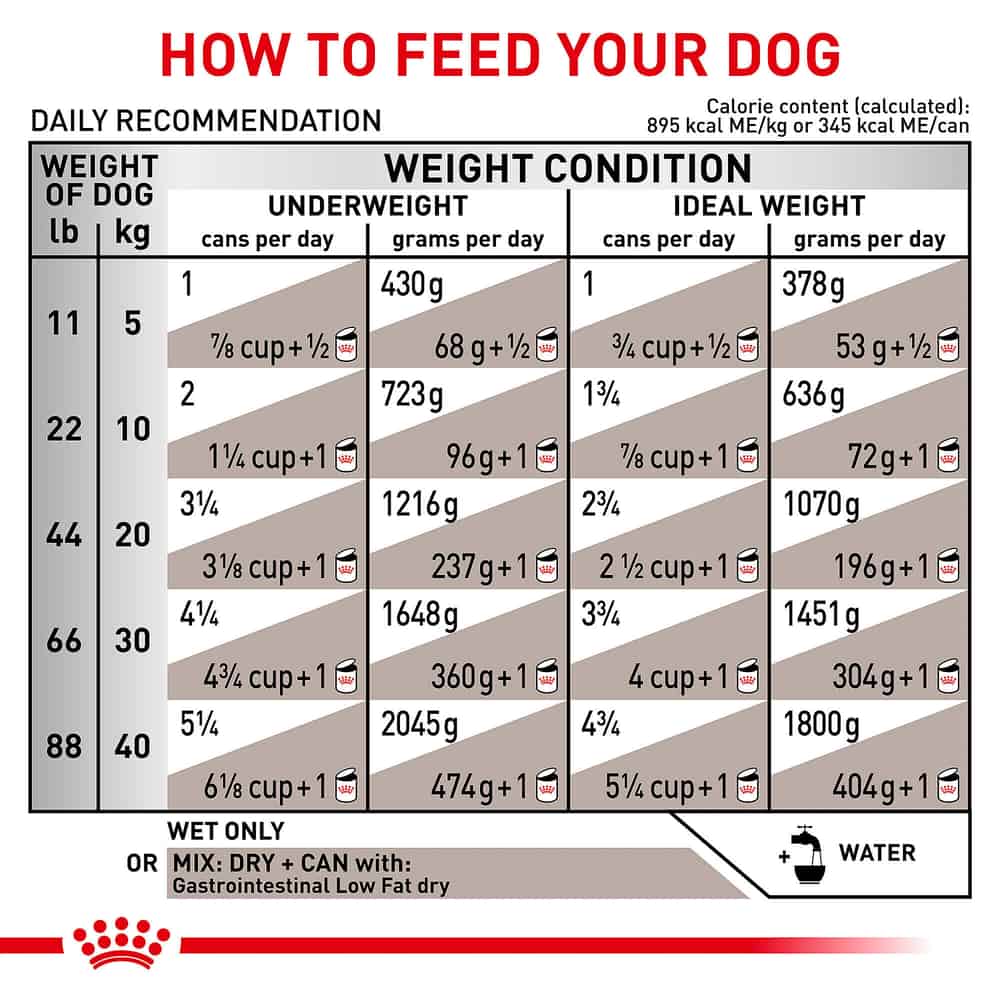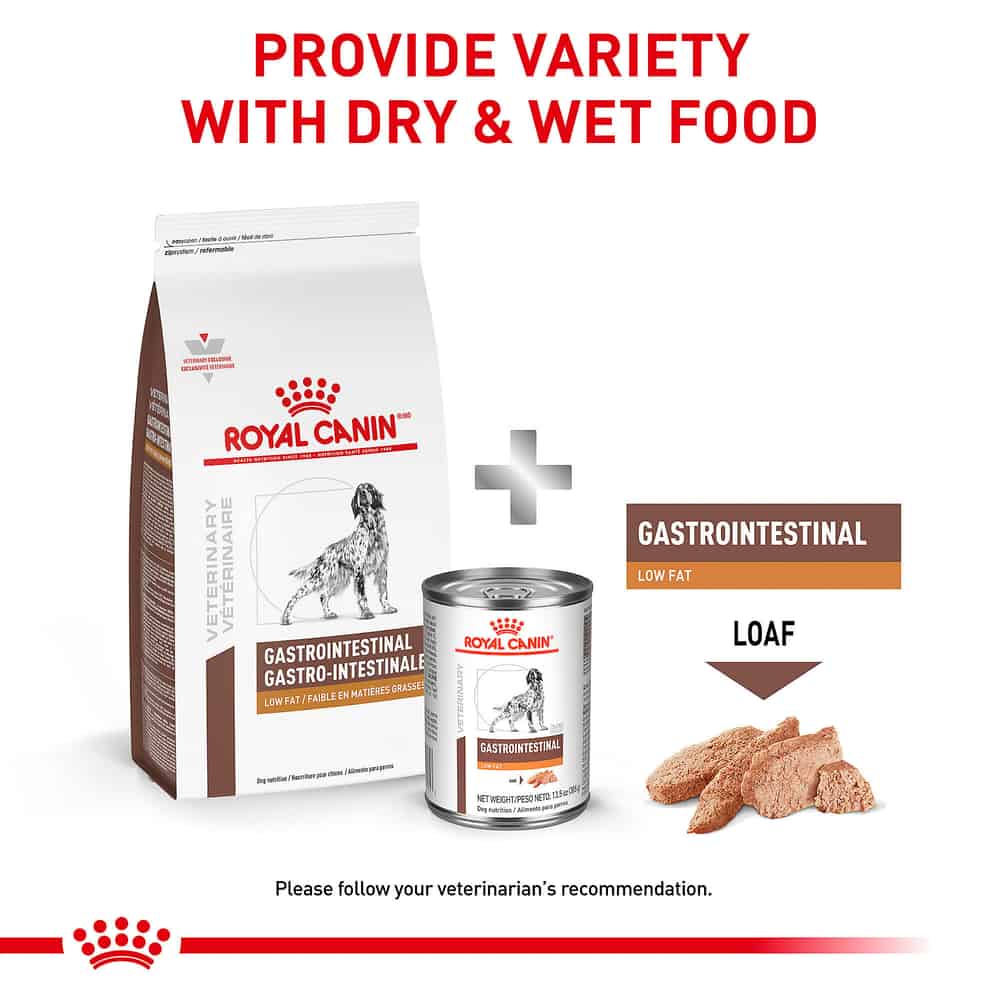 • When feeding Dry + Wet, this food is best mixed with Royal Canin Veterinary Diet Canine Gastrointestinal Low Fat Dry Dog Food.