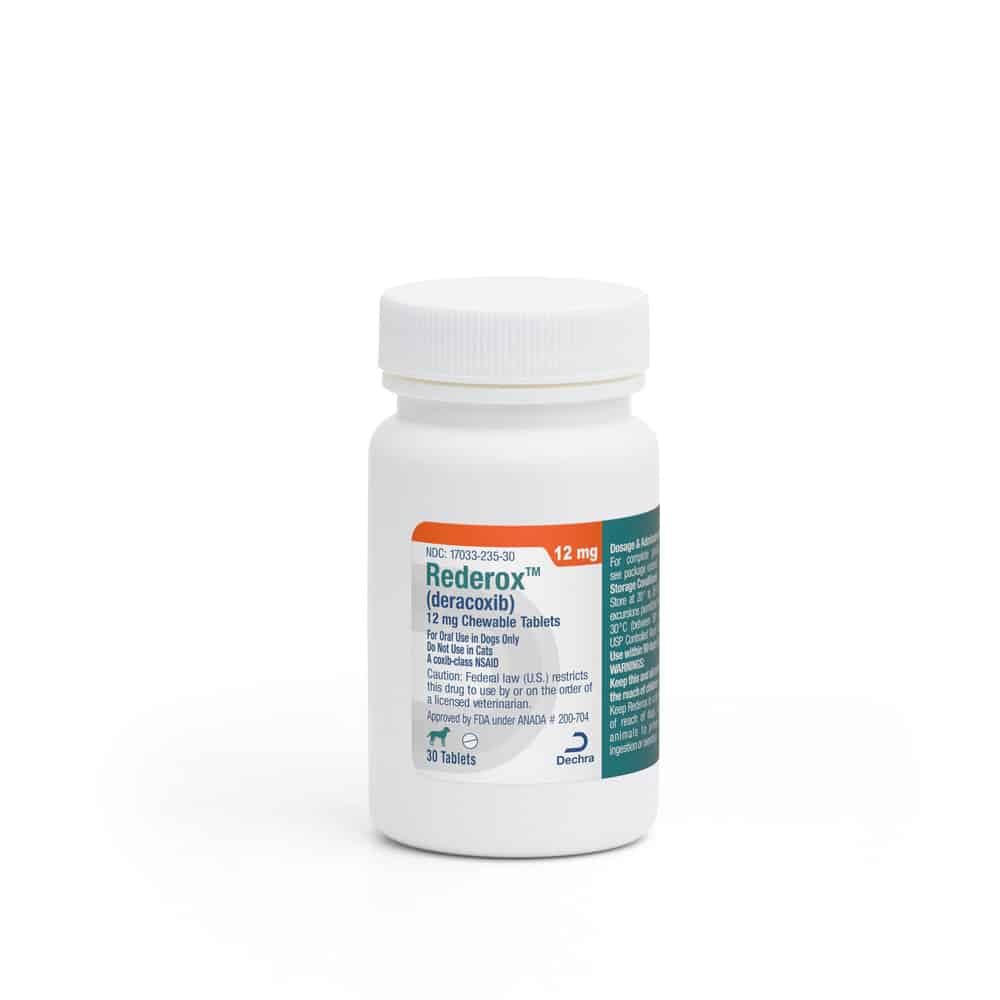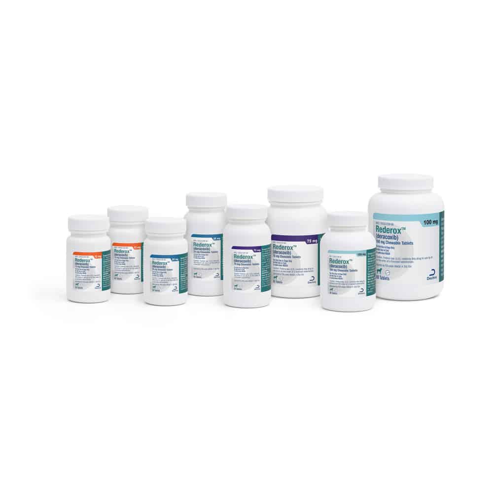 Rederox® (deracoxib) Chewable Tablets control pain and inflammation associated with Osteoarthritis, postoperative pain and inflammation associated with orthopedic surgery, and postoperative pain and inflammation associated with dental surgery in dogs.