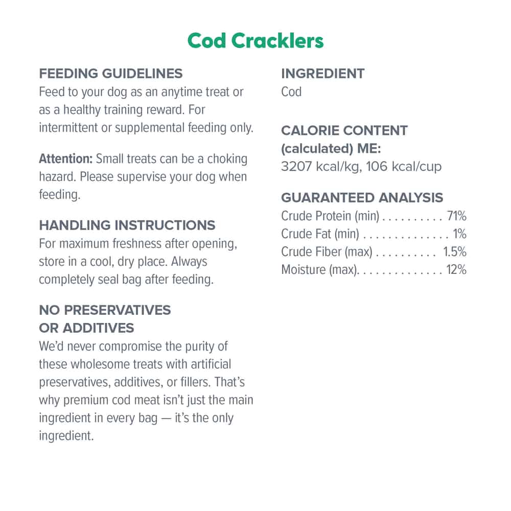 - While Cod Cracklers are simply premium cuts of wild-caught cod, it’s intended to be enjoyed as a treat and shouldn’t replace your dog’s daily meals.