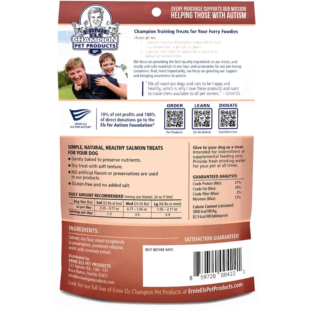 Crafted with protein-rich salmon as the first ingredient, Ernie Els soft and chewy treats are just the right size for training or simply treating as a nutritious reward.