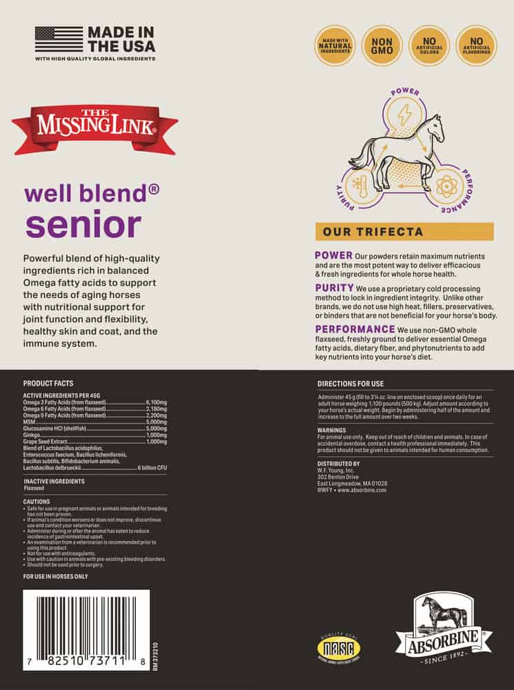 The Missing Link Well Blend® Senior Equine Powder Supplement is formulated specifically for older horses Helps maintain physical and mental well-being in senior and aging horses with specially selected ingredients that target their unique needs.